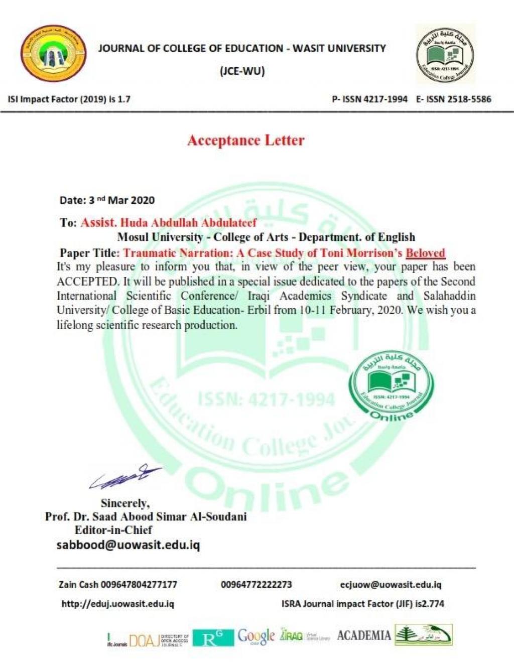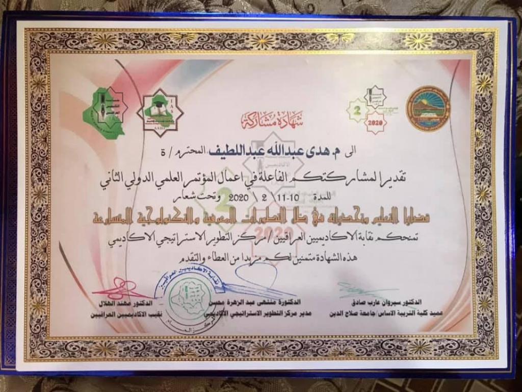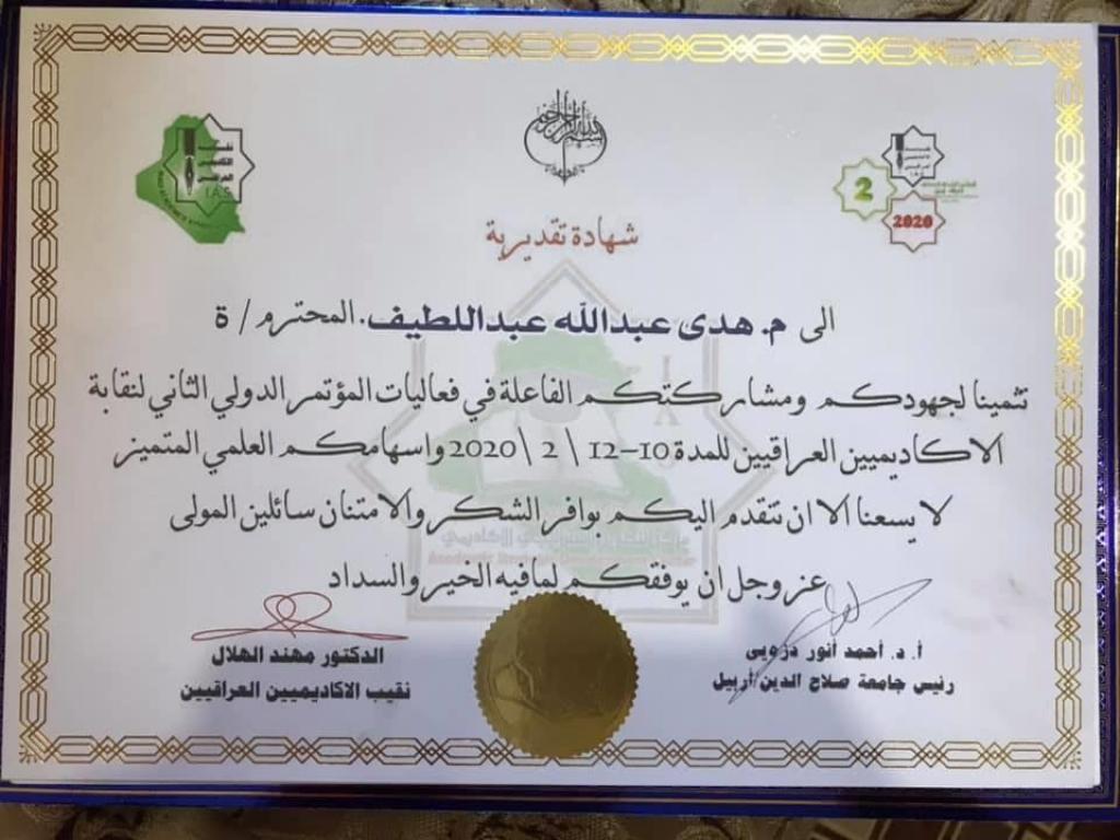 ضمن الإنجازات العلمية لتدريسيي كلية الآداب مشاركة التدريسية م. هدى عبدالله عبد اللطيف /قسم اللغة الإنكليزية في المؤتمر العلمي الدولي الثاني لنقابة الأكاديميين العراقيين ١٠-١١ شباط ٢٠٢٠ الذي أقيم في كلية التربية / جامعة صلاح الدين في أربيل وحصلت على شهادة مشاركة و شهادة تقديرية وقبول نشر البحث المشارك في مجلة كلية التربية / جامعة واسط ذات معامل تأثير
