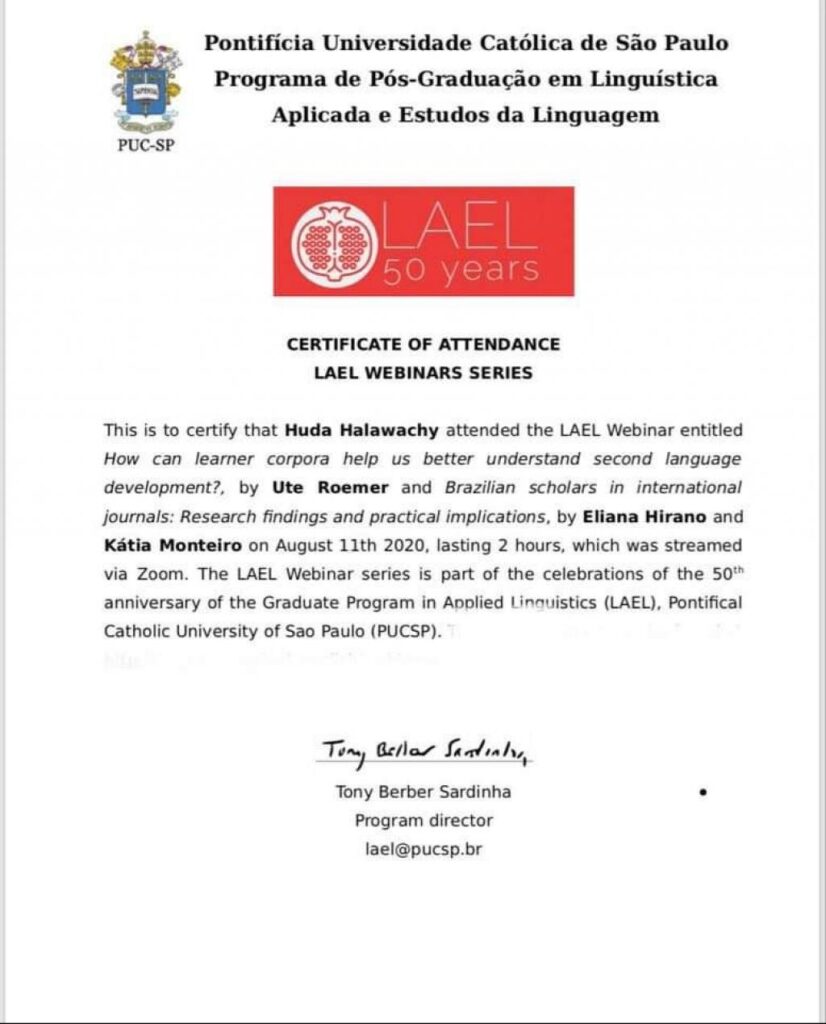 شاركت التدريسية في قسم اللغة الإنكليزية م. د. هدى فاضل حلاوجي في ويبنار لـ( LAEL)