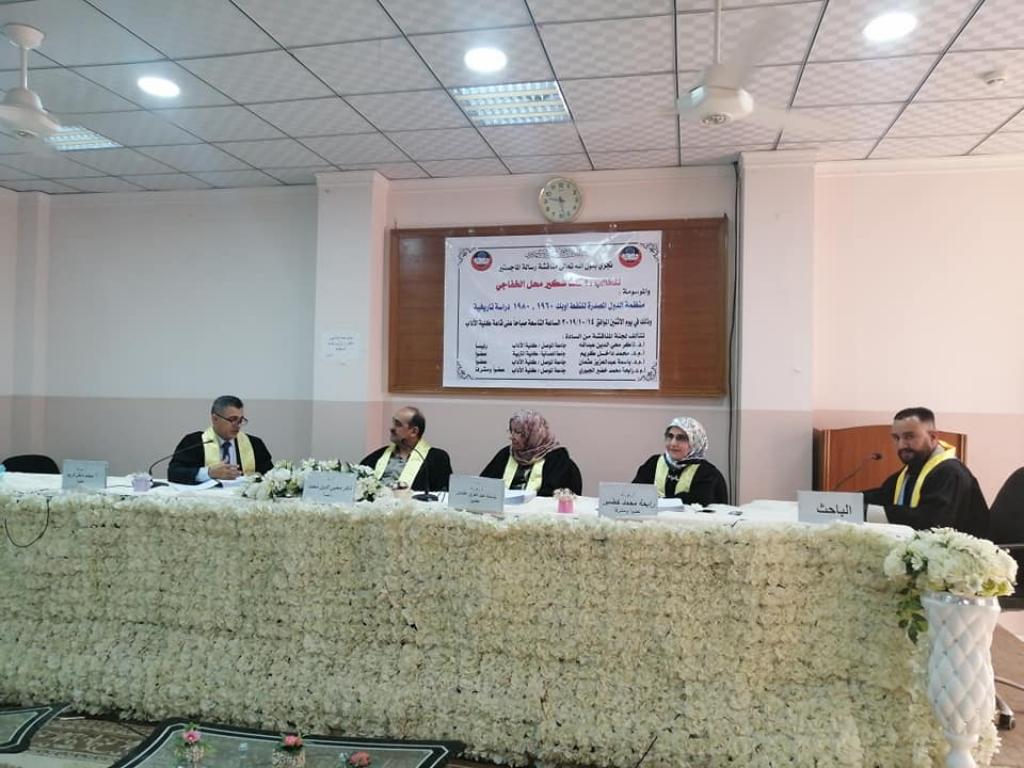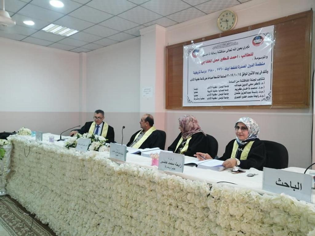 جرت اليوم الاثنين الموافق 14/10/2019 مناقشة رسالة ماجستير في التاريخ للطالب أحمد شكير محل عن رسالته المرسومة ( منظمة الدول المنظمة للنفط أوبك ١٩٦٠-١٩٨٠ دراسة تاريخية) بإشراف ا. م. د رابحة محمد خضير، وتالفت لجنة المناقشة من أ. د ذاكر محي الدين عبدالله رئيسا، وعضوية كلا من ا. م. د محمد داخل كريم، و ا. م. د باسمة عبدالعزيز عثمان.