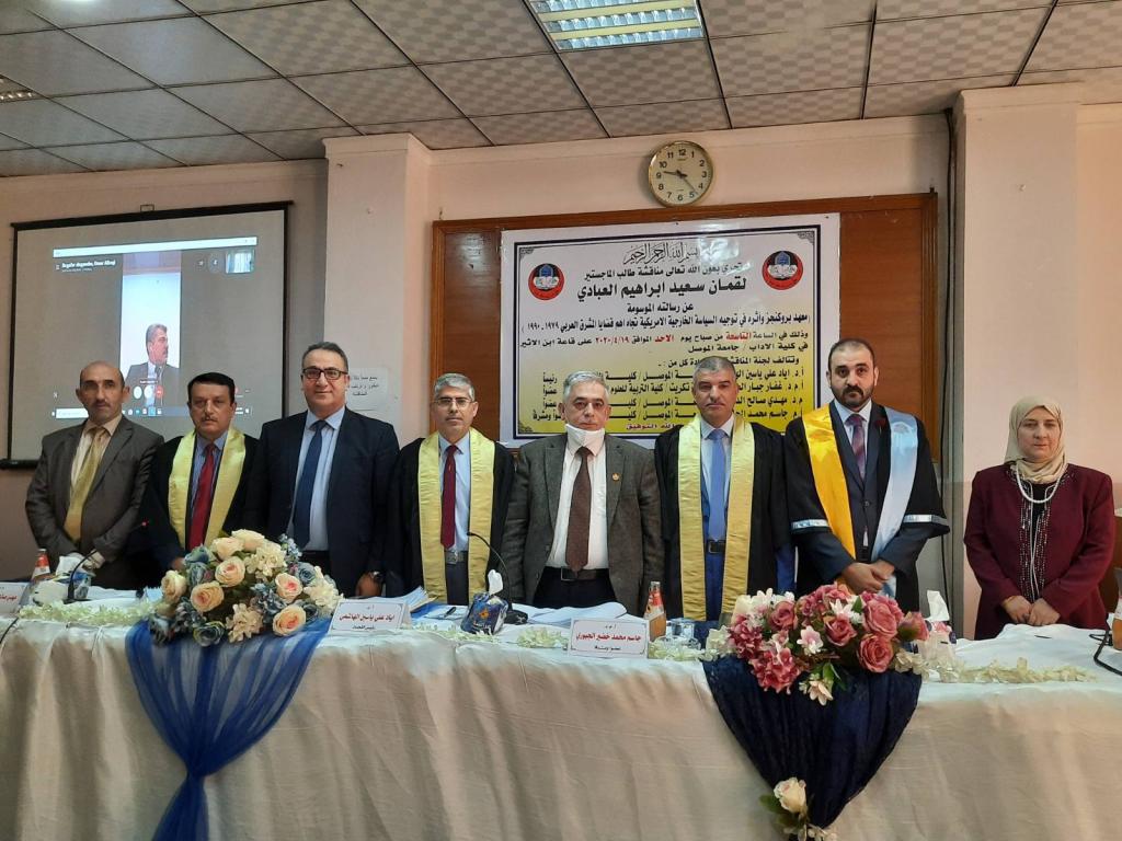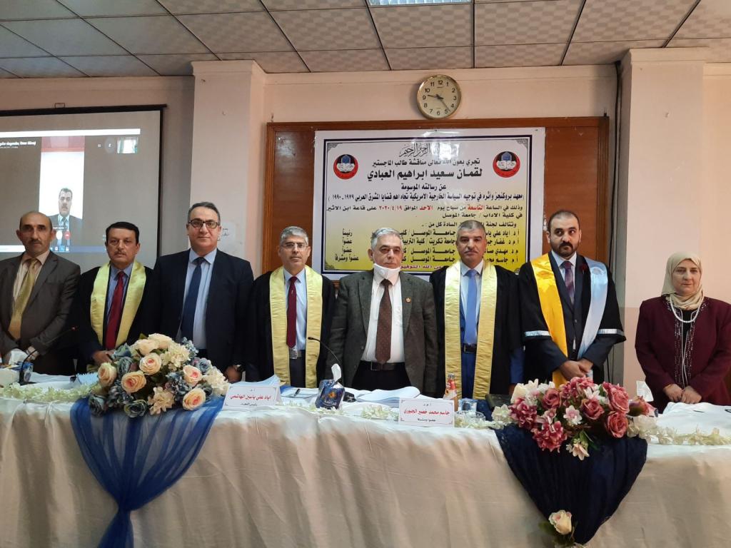 مناقشة رسالة ماجستير في التاريخجرت ـ بعون الله وفضله ـ وبحضور السيد مساعد رئيس جامعة الموصل للشؤون العلمية الأستاذ الدكتور منير سالم طه المحترم ـ مناقشة رسالة الماجستير في التاريخ للطالب للقمان سعيد إبراهيم العبادي الموسومة بـ(معهد بروكنجز واثره في توجيه السياسية الخارجية الامريكية تجاه اهم القضايا في المشرق العربي 1979 ـ 1990) ، وباشراف : أ.م. جاسم محمد الجبوري ، واستعمل برنامج سكايب للتواصل مع المناقش الخارجي ،وتألفت لجنة المناقشة من : أ.د. اياد علي ياسين ، وأ.م.د. غفار جبار الجنابي ، ومزد. مهدي صالح الدليمي