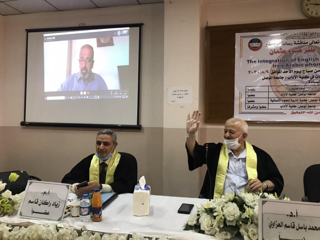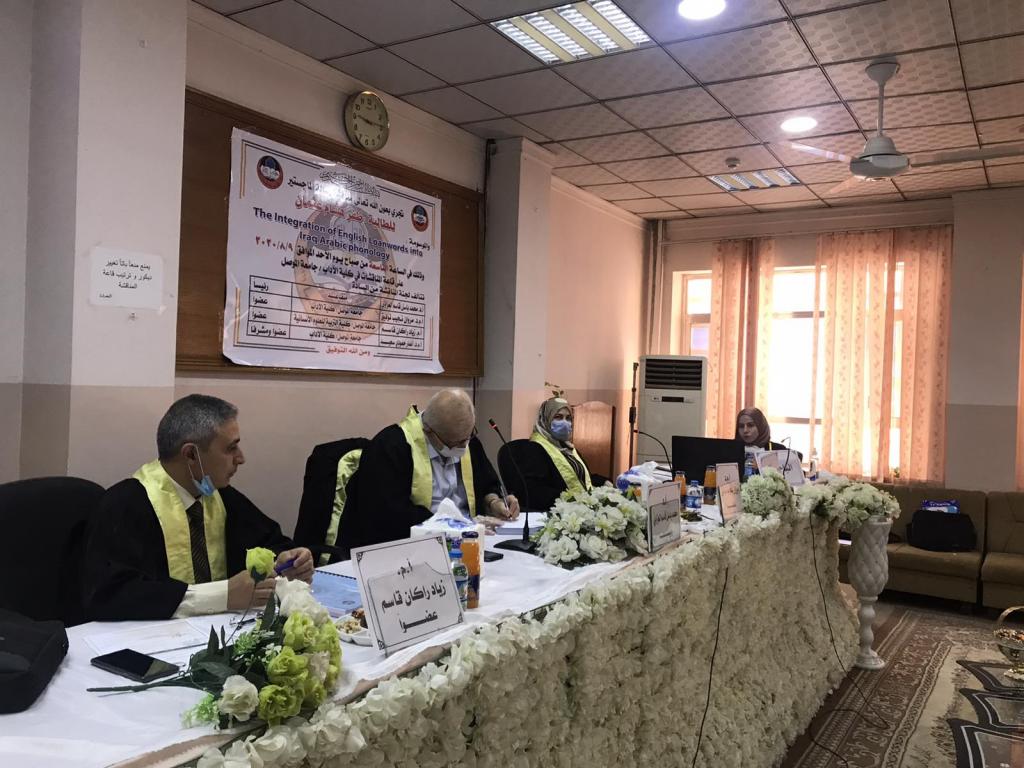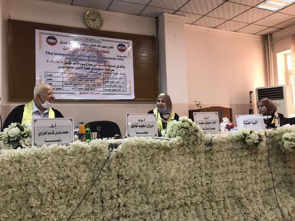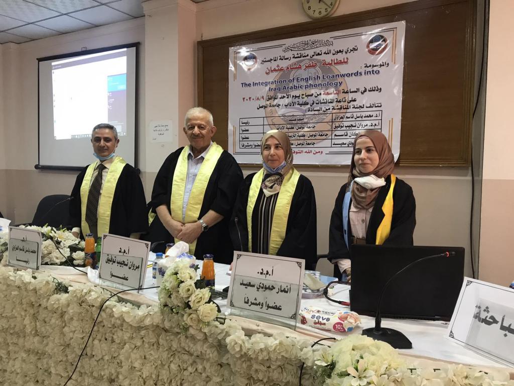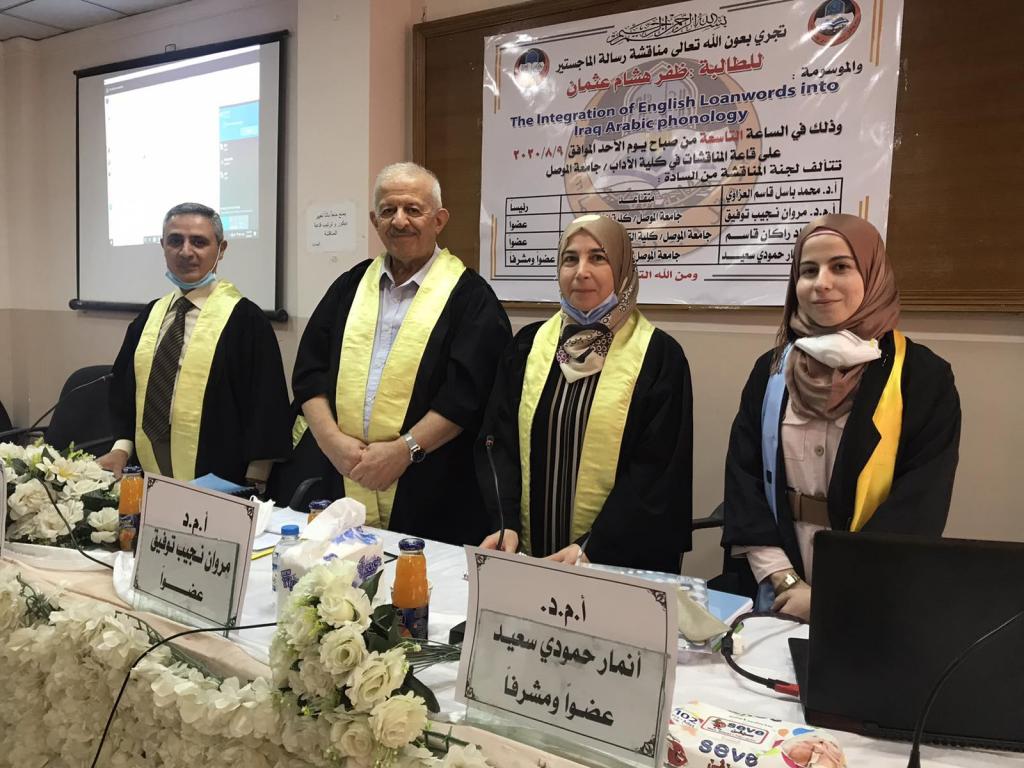 تم بعون الله وفضله مناقشة رسالة الماجستير في اللغة الانكليزية للطالبة ظفر هاشم عثمان الموسومة بـ(The Integration of English Loanwords into Iraqi Arabic Phonology) صباح اليوم الاجد الموافق : 9/8/2020 في قاعة ابن الاثير في كلية الآداب باشراف أ.م.د. انمار حمودي سعيد ، وتألفت لجنة المناقشة من : أ.د. محمد باسل قاسم العزاوي ، أ.م.د. مروان نجيب توفيق ، أ.م.زياد راكان قاسم