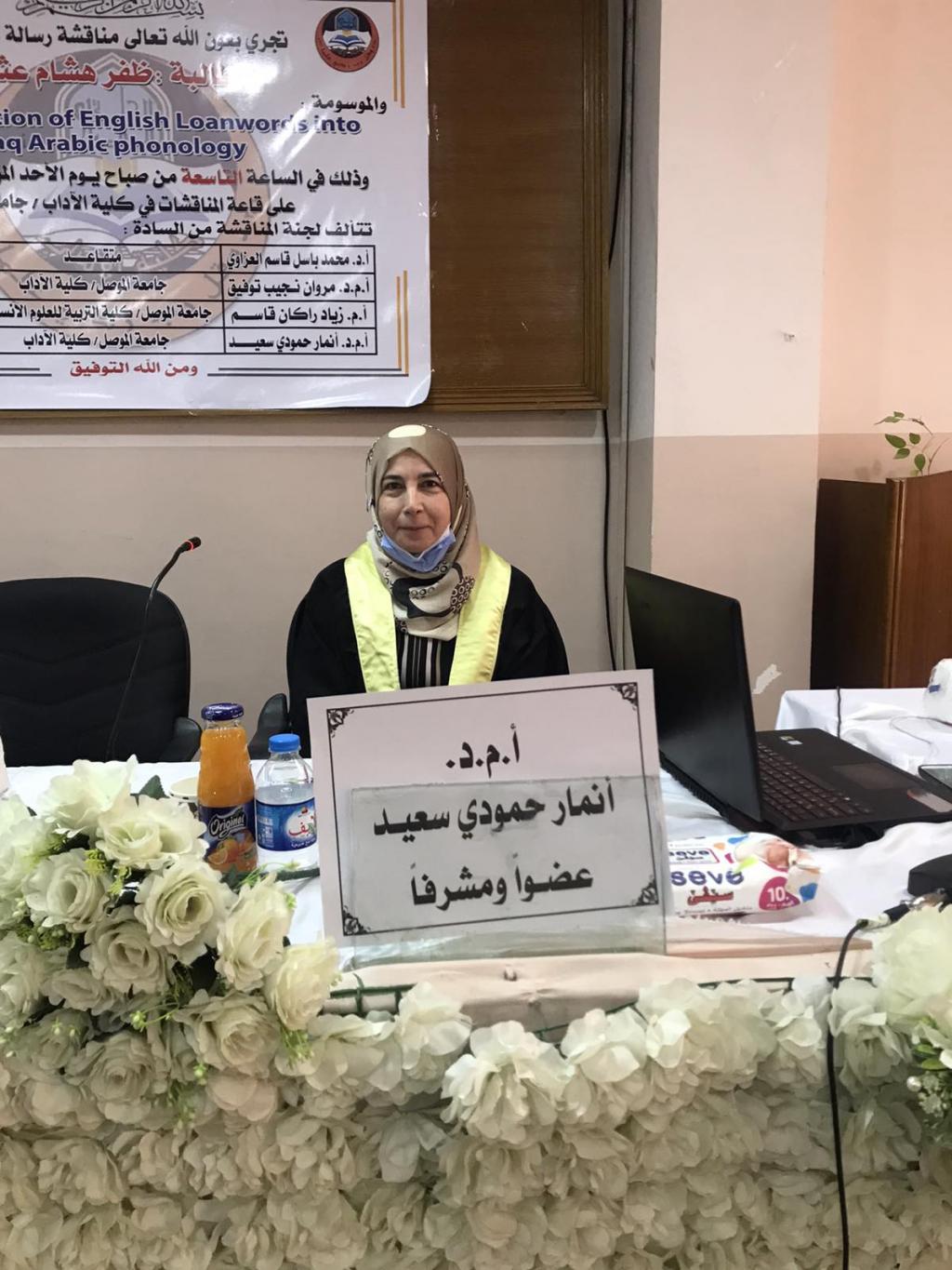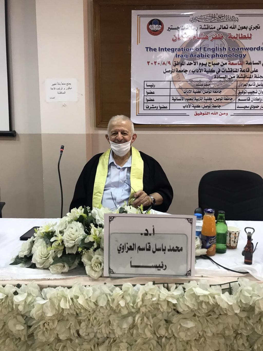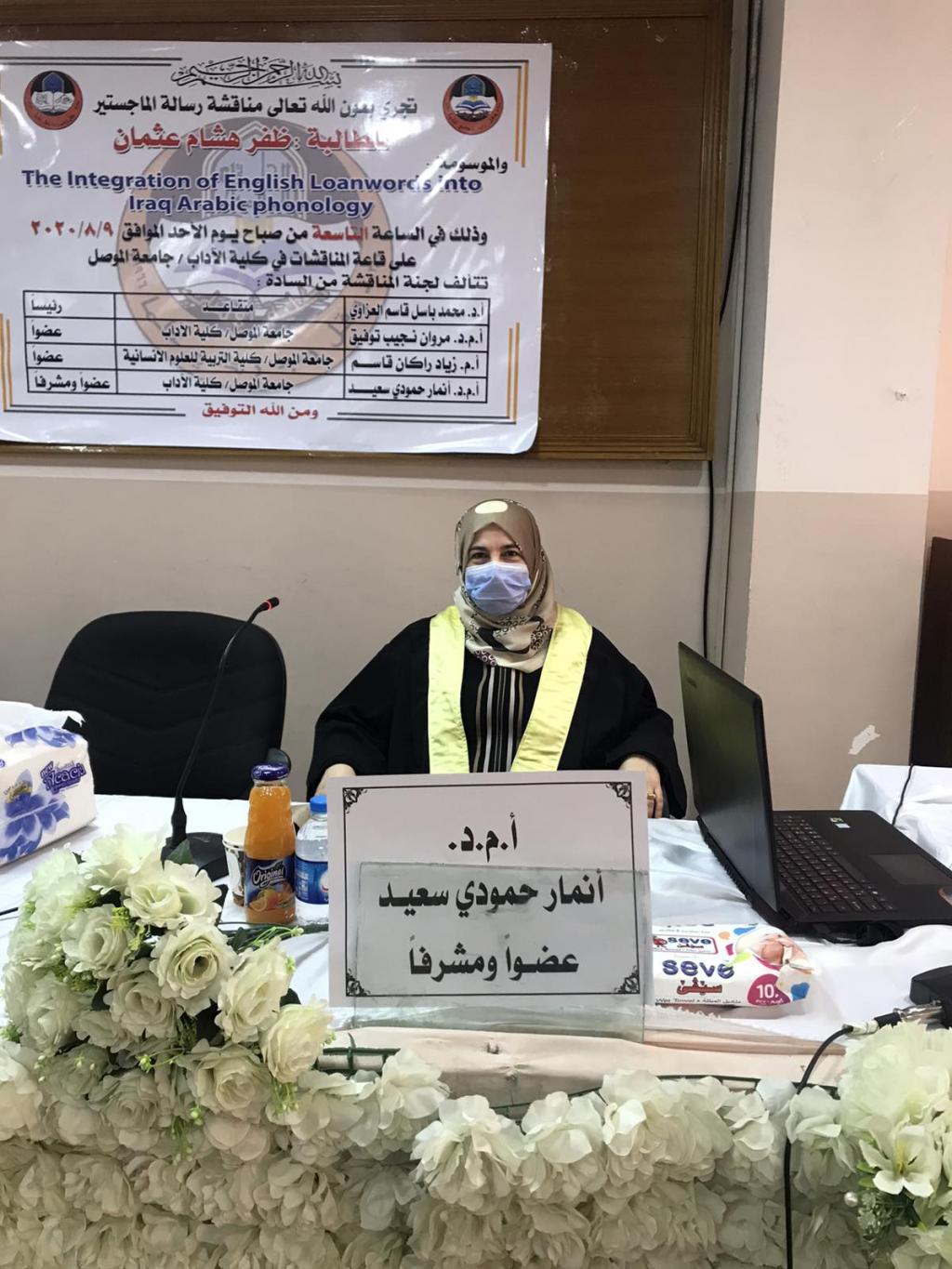 تم بعون الله وفضله مناقشة رسالة الماجستير في اللغة الانكليزية للطالبة ظفر هاشم عثمان الموسومة بـ(The Integration of English Loanwords into Iraqi Arabic Phonology) صباح اليوم الاجد الموافق : 9/8/2020 في قاعة ابن الاثير في كلية الآداب باشراف أ.م.د. انمار حمودي سعيد ، وتألفت لجنة المناقشة من : أ.د. محمد باسل قاسم العزاوي ، أ.م.د. مروان نجيب توفيق ، أ.م.زياد راكان قاسم