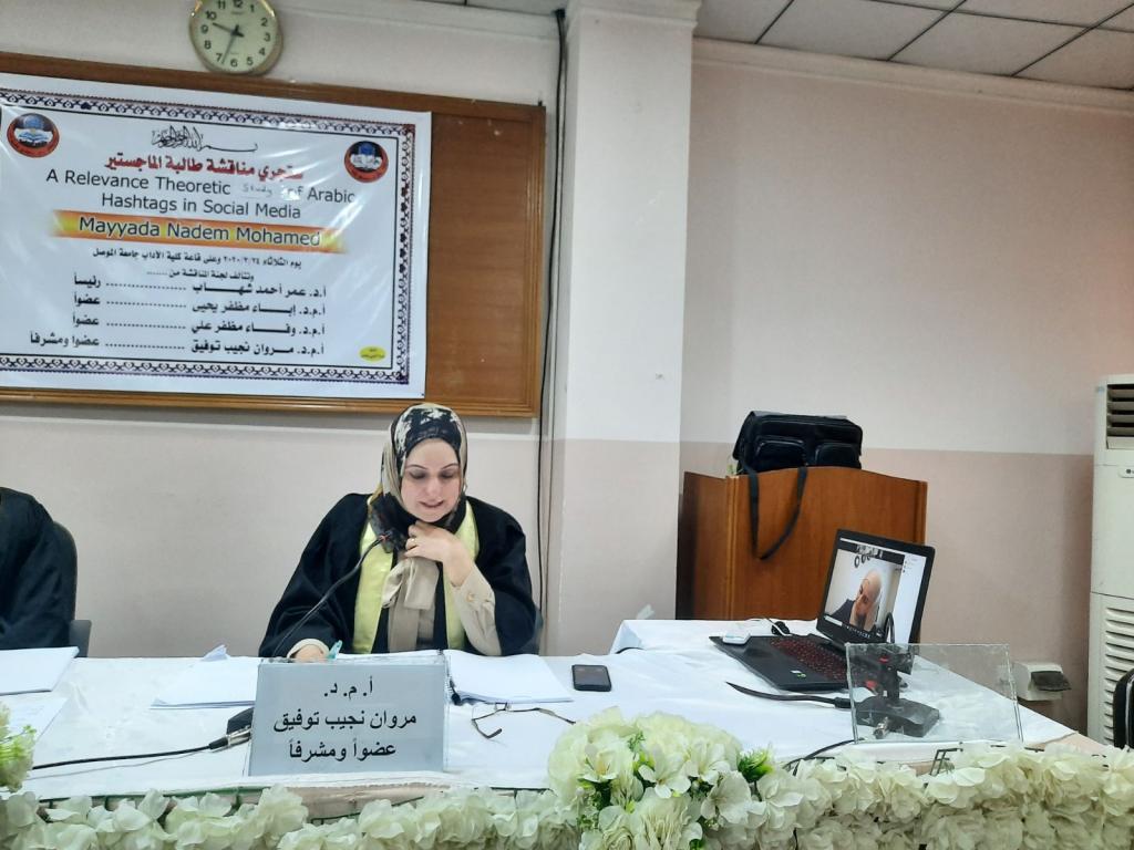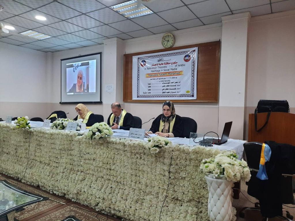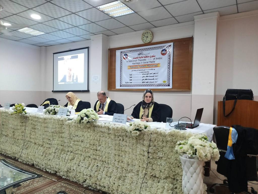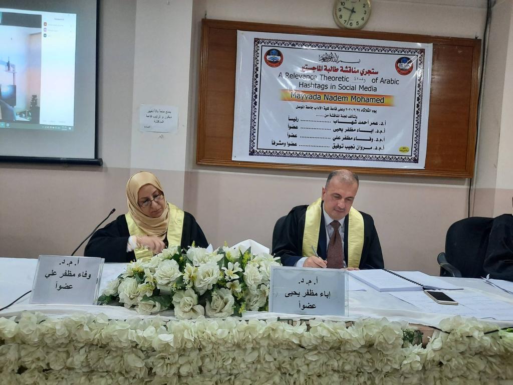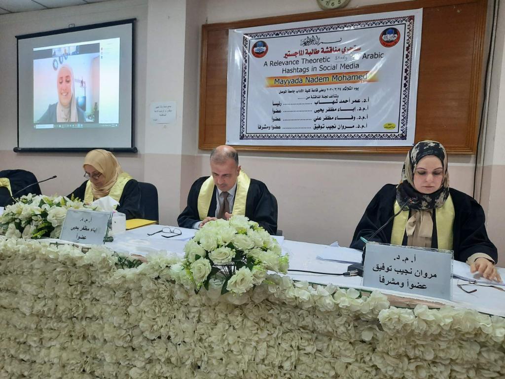 جرت ـ بفضل الله وعونه ـ مناقشة رسالة ماجستير في اللغة الإنكليزية للطالبة ميادة ناظم محمد يوم الأربعاء الموافق 7 / 5 / 2020م الموسومة بـ(الهاشتاك في وسائل التواصل الاجتماعي العربي ضمن نظرية المواءمة) باشراف : أ.م.د. مروان نجيب توفيق ، وتألفت لجنة المناقشة : أ.د. عمر احمد شهاب ، وأ.م.د. اباء مظفر يحيى ، وأ.م.د. وفاء مظفر علي ، وتتناول الرسالة قضية مهمة إذ تستقطبُ مواقعُ التواصلِ الاجتماعيّ عنايةَ الباحثين ولهذا الاستقطاب ادواته. وأحدُ أهم هذهِ الأدوات والتي وصفت بأنها علامةُ زماننا الحالي الهاشتاك ، والتي تعرف بأنها أداة تواصل تم اختراعها لتسهيل ِالتواصلِ المتصل بالشبكةِ العنكبوتية الانترنت. على الرغم من ذلك ، ليسَ ثمة َبحوث تتناول دورَ ومساهمةَ الهاشتاك في عملية الادراك والتحليل اللغوي لدى المستخدمين. هذه الدراسة تصبو لأكتشافِ هذا الدور من خلالِ دراسةٍ نوعيةٍ تستخدمُ نظرية المواءمة لسبيربرو ويلسون في تحليل اثني عشر هاشتاكاً في عشرة منشورات. إنَ نظريةَ المواءمة في هذا السياق قد تمَ تطويرُها بشكلٍ بسيط لتلائمَ بيئةَ مواقعِ التواصلِ الاجتماعي. الدراسةُ تفترضُ أنَّ: الهاشتاك يسهلُ عمليةَ الادراكِ والتحليلِ اللغويِّ ، فضلا عن ذلك لهُ عدةَ أدوارٍ تساهمُ في تسهيلِ عمليةِ الادراكِ ، فضلاً عن امتلاكه القدرةَ على تحويل القارئين من مشاركين خاملين وغير فاعلين الى فاعلين بشكل واضح. التحليل اظهرَ أنَّ الهاشتاك يمكن ان يلعب دورَ أداةٍ لاضافةِ المصداقية ، أو أداةٍ لمطابقةِ الفعلِ مع القول ، أو أداةٍ لتسليطِ الضوء ، أو محفزٍ ظاهري ، أو جزءٍ من المحفِز الظاهري ، أو أداةٍ للتسويق ، أو حاملٍ للفكرةِ والعنوان ، أو أداةٍ للتباهي ، كلَ هذا فضلا عن دوره كأداةٍ للتوثيقِ والفرز بصفتهِ الرقميةِ الالكترونية. التحليل اظهرـ أيضا ـ أنَّ الهاشتاك قادرٌ على منحِ القراء أنواعاً من التأثيرات ، هذه التأثيرات يمكن ان تكون اجتماعية ، عاطفيةً ، تعليميةً، تعريفيةً ، وترفيهيةً. لقد أظهرت النتائج أن الأدوارَ المختلفةَ للهاشتاك تساهمُ بخفضِ الجهدِ المبذولِ خلالِ عملية الادراك بالإضافة الى رفع التأثير المرجو من عملية التحليل اللغوي ، كذلكَ أظهرتِ النتائجُ أيَّ أنواع الهاشتاك يتطلب جهداً تحليليا عالياً لمعلاجةِ الجانب الظاهر والجانب المخفي ، بالإضافة الى الطرائقِ التي يمكن من خلالها جعل الهاشتاك ذا صلة وثيقة مثلى بالقراء من اجل تحويلهم من مشاركينَ غيرِ فاعلين الى مشاركين فاعلين.