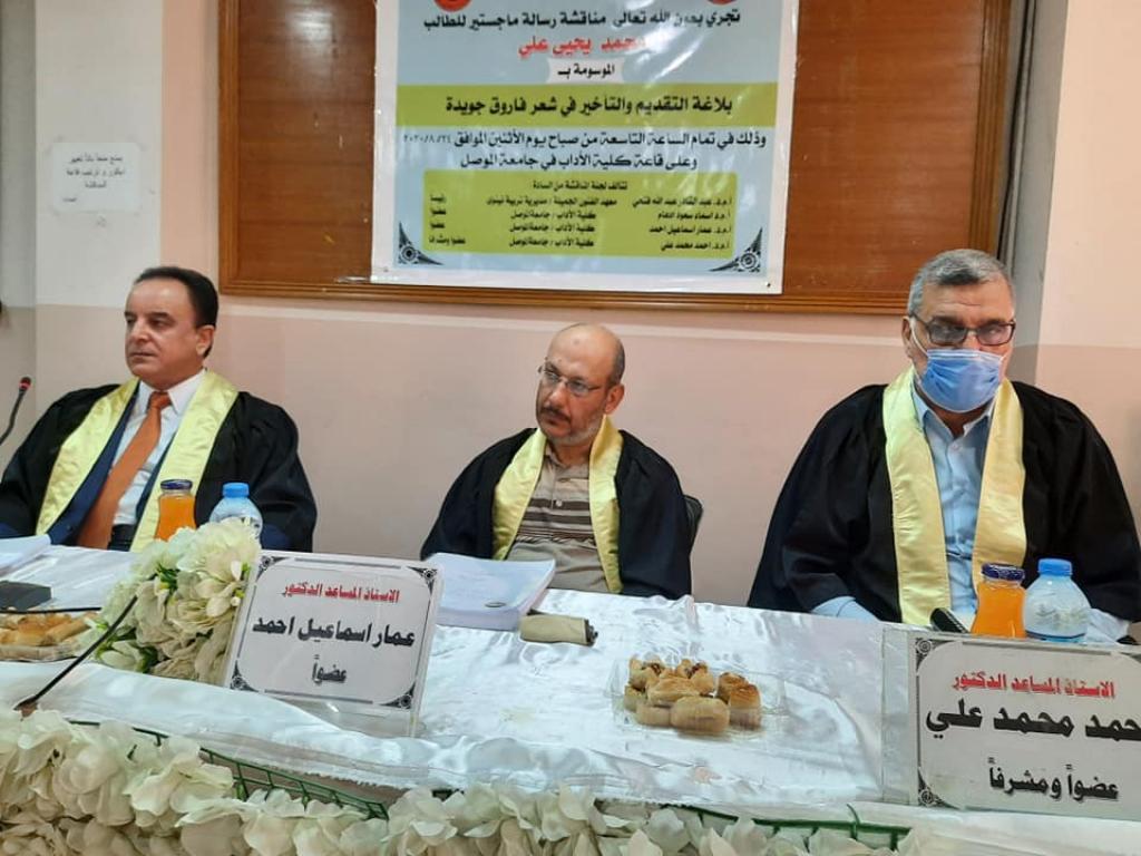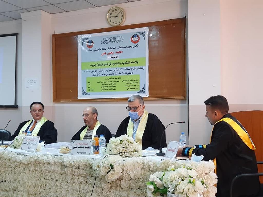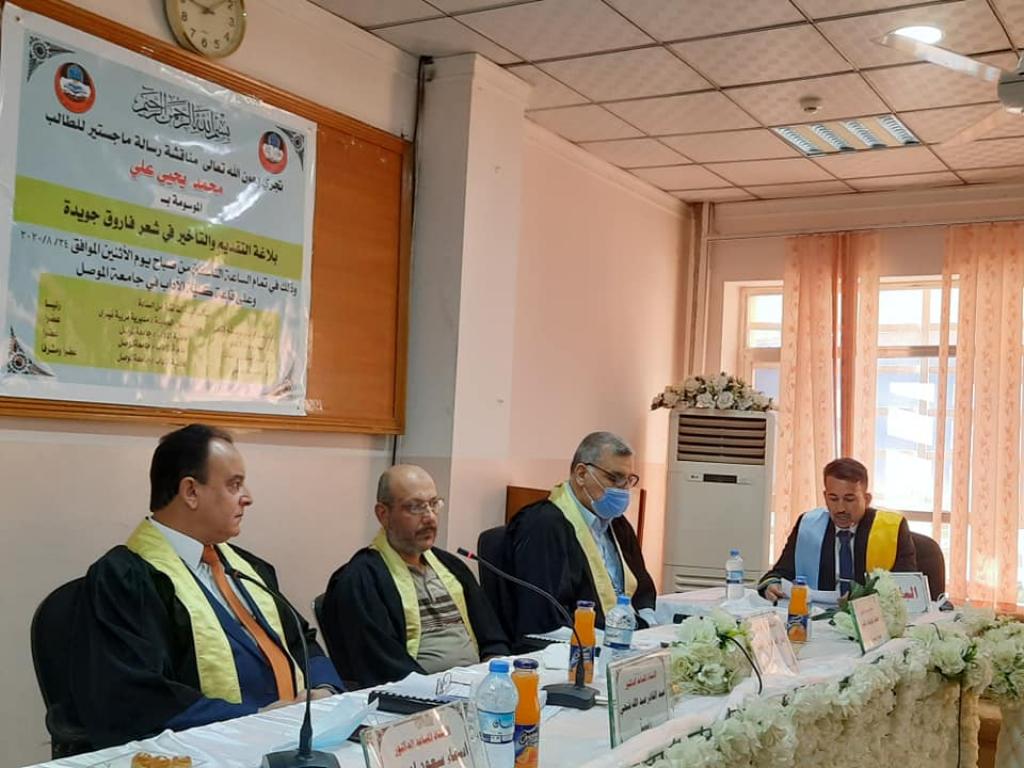 مناقشة رسالة ماجستير في اللغة العربية الموسومة بـ(بلاغة التقديم والتأخير في شعر فاروق جويدة)