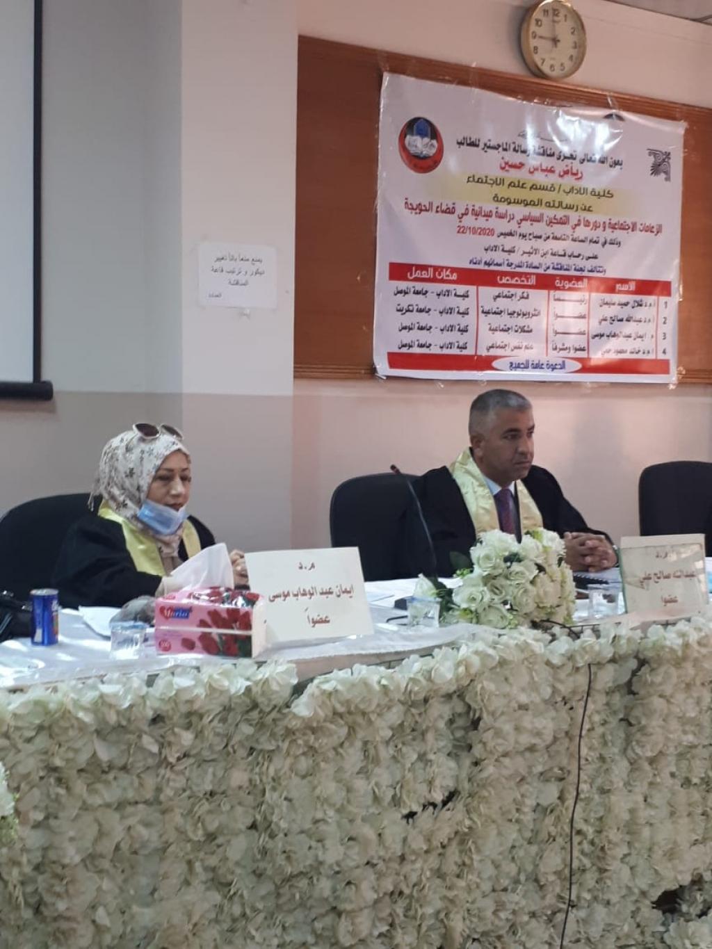 مناقشة رسالة ماجستير في علم الاجتماع بعنوان (الزعامات الاجتماعية ودورها في التمكين السياسي _دراسة ميدانية في قضاء الحويجة)