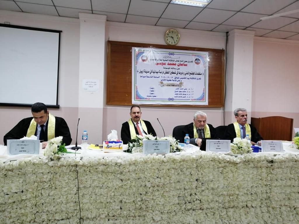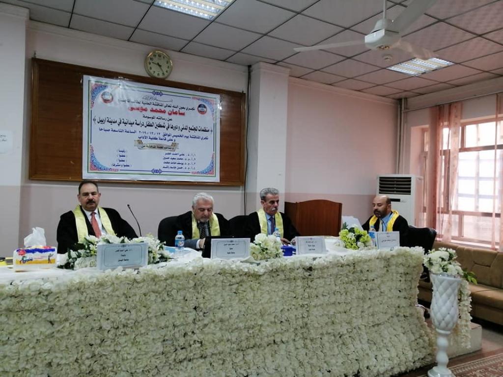 جرت اليوم الخميس الموافق 12/12/2019 وعلى قاعة ابن الأثير في كلية الآداب مناقشة رسالة ماجستير في علم الاجتماع للطالب سامان محمد موسى عن رسالته الموسومة (منظمات المجتمع المدني ودورها في تمكين الطفل دراسة ميدانية في مدينة أربيل) بإشراف أ.م.د حسن جاسم راشد، وتالفت لجنة المناقشة من أ.د علي أحمد خضر المعماري رئيسا، وعضوية كلا من أ.م.د محمد سعيد حسين، و أ.م.د يوسف حامد محمد.