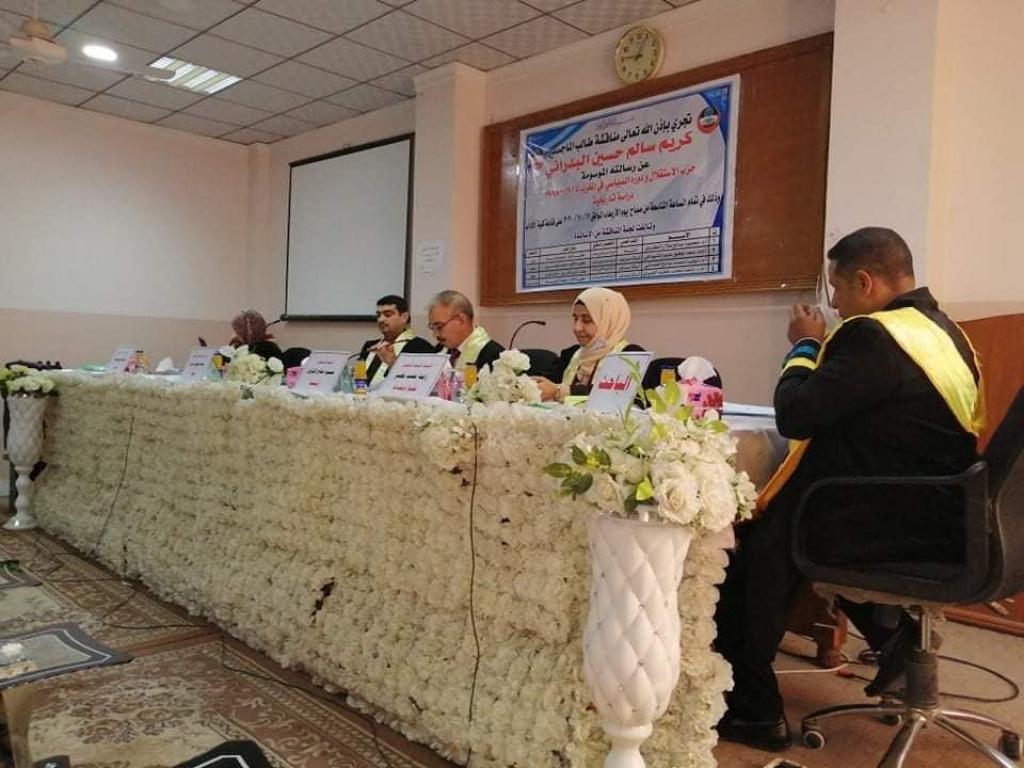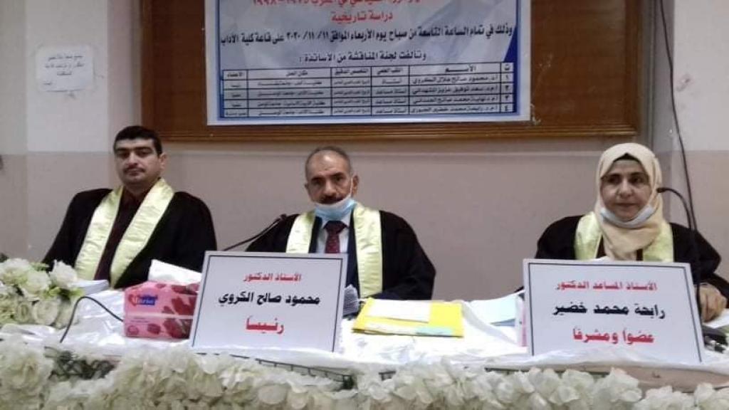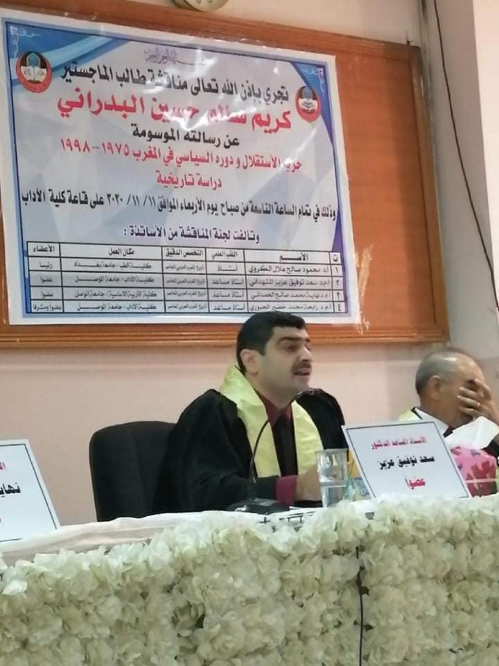 جرت – بعون الله وفضله – المناقشة العلنية لرسالة الماجستير في قسم التاريخ الموسومة بـ(حزب الاستقلال ودوره السياسي في المغرب 1975 – 1998 ) للطالب : كريم سالم حسين ، يوم الأربعاء الموافق 11 / 11/ 2020 في قاعة كلية الآداب ، وتألفت لجنة المناقشة من الاساتذة :1-أ. د. محمود صالح الكروي … رئيسا2- أ .م .د . سعد توفيق عزيز .. عضوا3- أ .م .د. نهاية محمد صالح .. عضوا4- أ.م.د. رابحة محمد خضير .. عضوا ومشرفاوبعد مناقشة الطالب في محتويات رسالته ودفاعها عنها ، قررت اللجنة منحه شهادة الماجستير في التاريخ الحديثوقد شكلت هذه الرسالة أضافة علمية جديدة للمكتبة العراقية والعربية . ذلك انها تناولت دور حزب الاستقلال في المغرب ولسنوات عدة وطبيعة هذا الدور السياسي في واقع المغرب وكذلك في سير مجريات الامور في تلك البلد خلال تلك السنوات الطويلة