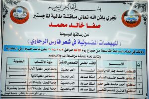 مناقشة رسالة ماجستير في كلية الآداب- قسم اللغة العربية بعنوان “المهيمنات المضمونية في شعر فارس الرحاوي” للطالبة صفا خالد محمد وبإشراف ا. م. د فاتن غانم فتحي بتاريخ ٧ كانون الاول ٢٠٢٥