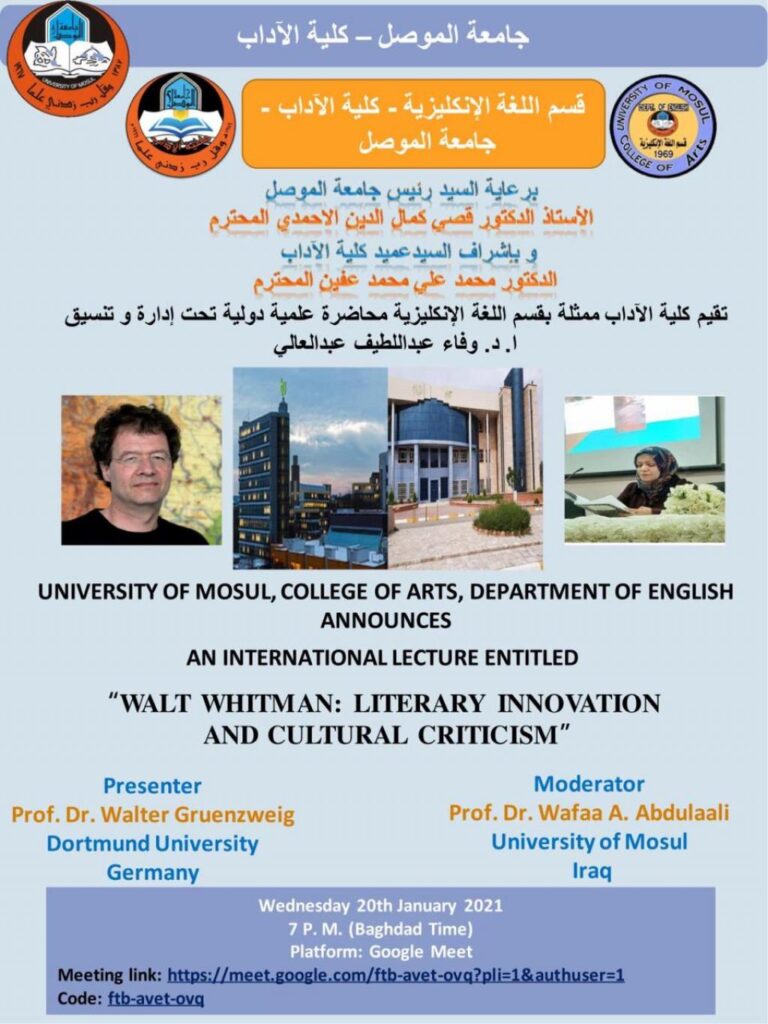برعاية السيد رئيس جامعة الموصل الأستاذ الدكتور قصي كمال الدين الأحمدي المحترم وبإشراف عميد كلية الآداب الدكتور محمد علي محمد عفين المحترم أقامت كلية الآداب ممثلة بقسم علم الاجتماع ندوة علمية آلكترونية بعنوان (الثقافة الحضرية في مدينة الموصل) يوم الأربعاء الموافق ٢٠١٢٠٢١ على تطبيق Google meet الساعة السابعة مساءً بتوقيت العراق والساعة الحادية عشر صباحًا بتوقيت شرق أمريكا ،وقد تضمنت اللجنة العلمية، أ.د. شفيق إبراهيم صالح رئيس القسم و أ.م.د. حسن راشد واللجنة التحضيرية م.د. إيمان عبد الوهاب موسى و م. ريم عبد الوهاب و م.م رضوان عجيل .