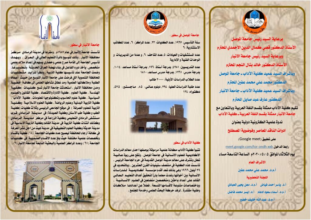 ندوة علمية الكترونية دولية بعنوان (ادوات الناقد المعاصر وفوضوية المصطلح)برعاية السيد رئيس جامعة الموصل الأستاذ الدكتور قصي كمال الدين الاحمدي المحترم وبرعاية السيد رئيس جامعة الانبار الأستاذ الدكتور خالد بتال النجم المحترم وبإشراف السيد عميد كلية الآداب ـ جامعة الموصل الدكتور محمد علي محمد عفين المحترم وبإشراف السيد عميد كلية الآداب ـ جامعة الانبار الدكتور عارف عبد صايل المحترماقامت كلية الآداب ممثلة بقسم اللغة العربية بالتعاون مع جامعة الانبار ممثلة بقسم اللغة العربية ـ كلية الآدابندوة علمية الكترونية دولية بعنوان (ادوات الناقد المعاصر وفوضوية المصطلح ) على تطبيق (Google meet)اليوم الثلاثاء الموافق 5 / 5/ 2020م الساعة التاسعة مساءالاشراف العام : أ.م.د. محمد علي محمد عفيناللجنة التحضيرية : أ.د. ياسر احمد فياض أ.م.د. معن يحيى العبادي ، أ.م.د. أسماء سعود ادهام ، أ.د. ايسر محمد فاضل ، أ.م.د. عبد الله خليف خضيراهداف الندوة :تسعى هذه الندوة الى تسليط الضوء على قضية لغوية مهمة ألا وهي المصطلح النقدي ، إذ يعد محطة لا غنى عنها في حال من الأحوال ، فالنقد الأدبي فرع من فروع العلوم الإنسانية من والمصطلح النقدي يمثل مدخلا معرفيا مهما ؛ ذلك أن كثيرا من المسائل والمفاهيم تعتمد على تحديده ، فضلا عن ذلك يعد المصطلح عتبة علمية معرفية تيسر عملية القراءة والفهم والافهام ، فإن حدث خلل في المصطلح انعكس ذلك على فهم بقية المسائل التي تتعلق به ؛ لذا كان تداخل المصطلح يشكل عقبة حقيقة امام الناقد ومن هنا حاول الناقد ان يجعل المصطلح وتشعباته من ادواته النقدية التي يرتكز عليها في فهمه للمسائل المعرفية ، فكان عليه اولا وضع النقاط على الحروف عبر تبني المصطلح بتحديده الدقيق والابتعاد عما يشوبه من قضايا قد تشوه مجمل المعرفة العلمية ولا سيما فيما يتعلق بالقضايا الانسانية ، فجاءت هذه الندوة محاولة لاكتشاف تلك الادوات التي يعتمدها الناقد في معرفته الا وهي المصطلح ، ومع كثرة المشاركين وما سيدلون به من جعبتهم الا أن هذه القضية تحتاج الى تعمق اكثر وبحوث مطولة ومع ذلك جاءت هذه الندوة خطوة ضمن مشروع لساني لتسليط الضوء على قضايا عالقة ومحاولة لوضع مفاتيح لقراء النصوص قراءة معمقةشارك في هذه الندوة ويقدم أوراق عملها كلّ من :