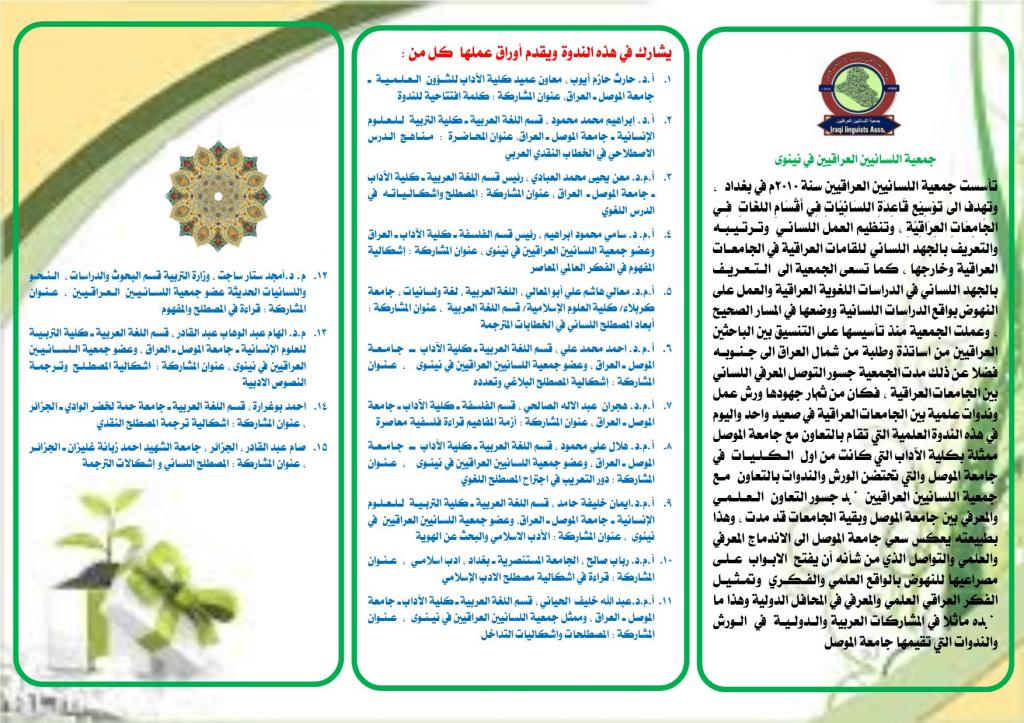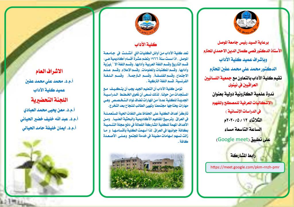 برعاية السيد رئيس جامعة الموصل الأستاذ الدكتور قصي كمال الدين الاحمدي المحترموبإشراف عميد كلية الآداب الدكتور محمد علي محمد عفين المحترماقامت كلية الآداب بالتعاون مع جمعية اللسانيين العراقيين في نينوى ندوة علمية الكترونية دولية بعنوان (الإشكاليات المعرفية للمصطلح والمفهوم في الدراسات الإنسانية ) اليوم الثلاثاء الموافق 12 / 5/ 2020م الساعة التاسعة مساء على تطبيق (Google meet) ، وهدفت هذه الندوة الى تسليط الضوء على ازمة المصطلحات ولا سيما تلك المصطلحات التي اقترنت بازدواجية في الاستعمال اعتماد على بيئة هذا المصطلح ومكانه وزمانه وكذلك المجاميع البشرية التي تبنته ، وكذلك سلط الندوة الضوء على الإشكاليات المعرفية التي تصاحب العلاقة بين المفهوم والمصطلح ، المفهوم الذي سبق المصطلح ، ثم اطلق عليه الاصطلاح وبعد ذلك دخل هذا المصطلح إشكالات عدة ولا سيما فيما يتعلق بالاستعمال اللغوي والمفاهيمي ، وتندرج هذه الندوة ضمن المنهج اللساني الذي تبنته كلية الآداب وتعاونت معها جمعية اللسانيين العراقيين لتسلط الضوء على قضايا لسانية ومنهجية لتفجير الطاقات المعرفية والعلمية والنهوض بالواقع العلمي فضلا عن التنسيق بين أساتذة الدرس اللغوي في العراق والعالم ، فشارك في هذه الورشة نخبة من تدريسي جامعة الموصل فضلا عن الجامعات العراقية والعربية ، فشارك في هذه الندوة وقدم أوراق عملها كل من : أ.د. حارث حازم أيوب ، معاون عميد كلية الآداب للشؤون العلمية ـ جامعة الموصل ـ العراق، عنوان المشاركة : كلمة افتتاحية للندوة أ.د. إبراهيم محمد محمود ، قسم اللغة العربية ـ كلية التربية للعلوم الإنسانية ـ جامعة الموصل ـ العراق، عنوان المحاضرة : مناهج الدرس الاصطلاحي في الخطاب النقدي العربي أ.د. سناء طاهر ، قسم اللغة العربية ، كلية التربية للعلوم الانسانية ، جامعة الموصل ، عنوان المشاركة : (بين الصرف والصريف وقفة مع المصطلح)أ.د. رباب صالح ، الجامعة المستنصرية ـ بغداد ، ادب اسلامي ، عنوان المشاركة : قراءة في اشكالية مصطلح الادب الإسلاميأ.م.د. معن يحيى محمد العبادي ، رئيس قسم اللغة العربية ـ كلية الآداب ـ جامعة الموصل ـ العراق ، عنوان المشاركة : المصطلح واشكالياته في الدرس اللغوي أ.م. د. سامي محمود ابراهيم ، رئيس قسم الفلسفة ـ كلية الآداب ـ العراق وعضو جمعية اللسانيين العراقيين في نينوى ، عنوان المشاركة : إشكالية المفهوم في الفكر العالمي المعاصرأ.م.د. معالي هاشم علي أبو المعالي ، اللغة العربية ، لغة ولسانيات ، جامعة كربلاء/ كلية العلوم الإسلامية/ قسم اللغة العربية ، عنوان المشاركة : أبعاد المصطلح اللساني في الخطابات المترجمةأ.م.د. احمد محمد علي ، قسم اللغة العربية ـ كلية الآداب ـ جامعة الموصل ـ العراق ، وعضو جمعية اللسانيين العراقيين في نينوى ، عنوان المشاركة : إشكالية المصطلح البلاغي وتعددهأ.م.د. هجران عبد الاله الصالحي ، قسم الفلسفة ـ كلية الآداب ـ جامعة الموصل ـ العراق ، عنوان المشاركة : أزمة المفاهيم قراءة فلسفية معاصرةأ.م.د. هلال علي محمود ، قسم اللغة العربية ـ كلية الآداب ـ جامعة الموصل ـ العراق ، وعضو جمعية اللسانيين العراقيين في نينوى ، عنوان المشاركة : دور التعريب في اجتراح المصطلح اللغوي أ.م.د.ايمان خليفة حامد ، قسم اللغة العربية ـ كلية التربية للعلوم الإنسانية ـ جامعة الموصل ـ العراق، وعضو جمعية اللسانيين العراقيين في نينوى ، عنوان المشاركة : الأدب الاسلامي والبحث عن الهوية أ.م.د.عبد الله خليف الحياني ، قسم اللغة العربية ـ كلية الآداب ـ جامعة الموصل ـ العراق ، وممثل جمعية اللسانيين العراقيين في نينوى ، عنوان المشاركة : المصطلحات واشكاليات التداخلم. د.أمجد ستار ساجت ، وزارة التربية قسم البحوث والدراسات ، النحو واللسانيات الحديثة عضو جمعية اللسانيين العراقيين ، عنوان المشاركة : قراءة في المصطلح والمفهومم.د. الهام عبد الوهاب عبد القادر ، قسم اللغة العربية ـ كلية التربية للعلوم الإنسانية ـ جامعة الموصل ـ ال