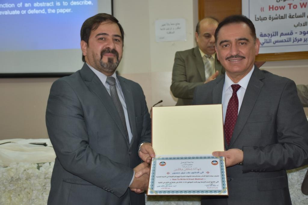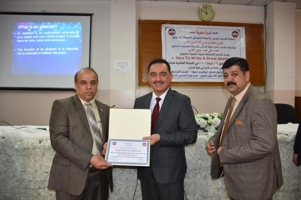 برعاية السيد رئيس جامعة الموصل الاستاذ الدكتور قصي الاحمدي وبإشراف عميد كلية الآداب الدكتور محمد علي عفين أقام قسم الترجمة في كلية الآداب بالتعاون مع مركز التحسس النائي في جامعة الموصل اليوم الأحد الموافق 23/2/ندوة علمية تحت عنوان (How To Write A Great Abstract عن كيفية كتابة مستخلصات البحوث باللغة الإنكليزية، وألقى المحاضرة كلا من الدكتور محمد إبراهيم حمود من قسم الترجمة والدكتور علاء نبيل حمدون مدير مركز التحسس النائي في جامعة الموصل، بحضور السيد رئيس الجامعة ومساعده للشؤون العلمية