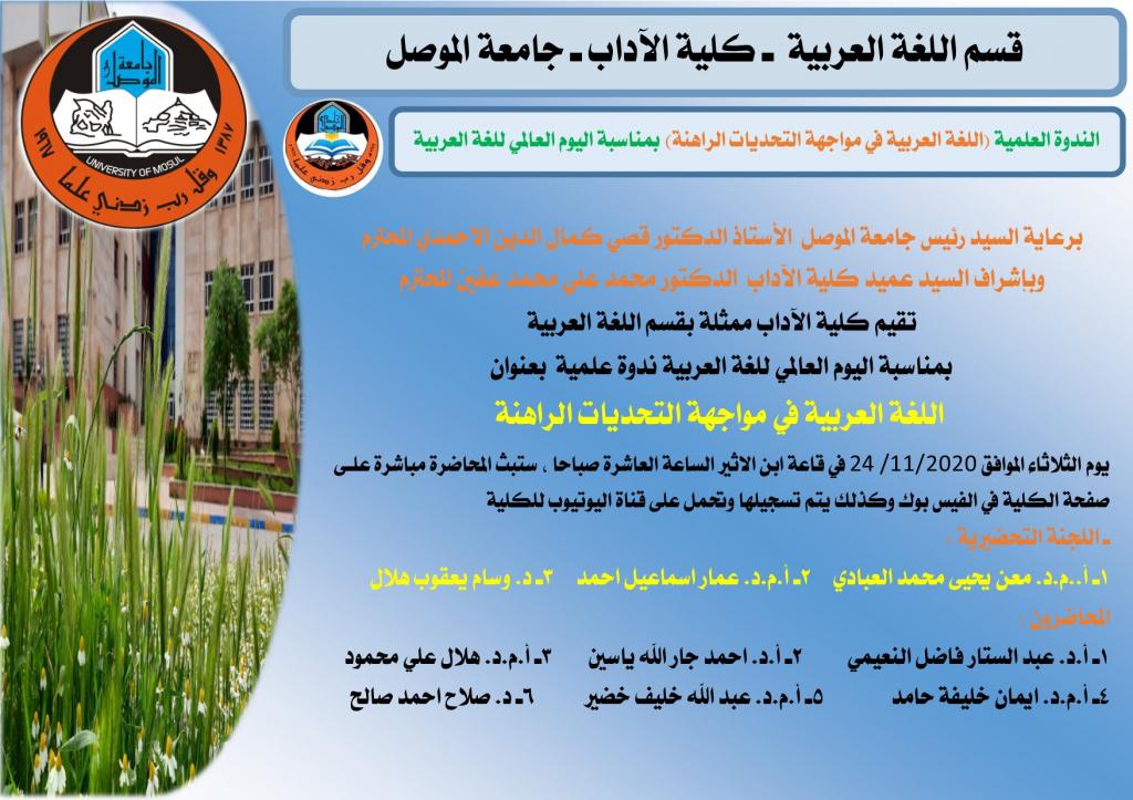 برعاية السيد رئيس جامعة الموصل الأستاذ الدكتور قصي كمال الدين الاحمدي المحترموبإشراف السيد عميد كلية الآداب الدكتور محمد علي محمد عفين المحترمتقيم كلية الآداب ممثلة بقسم اللغة العربية بمناسبة اليوم العالمي للغة العربية ندوة علمية بعنوان (اللغة العربية في مواجهة التحديات الراهنة) يوم الثلاثاء الموافق 24 /11/2020 في قاعة ابن الاثير الساعة العاشرة صباحا ، ستبث المحاضرة مباشرة على صفحة الكلية في الفيس بوك وكذلك يتم تسجيلها وتحمل على قناة اليوتيوب للكلية ، وفيما يأتي تفاصيل الندوة :اللجنة التحضيرية :1ـ أ..م.د. معن يحيى محمد العبادي2ـ أ.م.د. عمار اسماعيل احمد3ـ د. وسام يعقوب هلالالمحاضرون :1ـ أ.د. عبد الستار فاضل النعيمي2ـ أ.د. احمد جار الله ياسين3ـ أ.م.د. هلال علي محمود4ـ أ.م.د. ايمان خليفة حامد5ـ أ.م.د. عبد الله خليف خضير الحياني6ـ د. صلاح احمد صالحاهداف الندوة : تهدف الندوة التي تسليط الضوء على القضايا الراهنة التي تواجه اللغة والعربية ولا سيما في مجال تطور وسائل التواصل الاجتماعي واثر هذه الوسائل في استعمال اللغة العربية والازدواجية اللغة التي تعد من اهم التحديات التي تواجه اللغة العربية إذ يميل الكثير من الناس الى الدمج في استعمال اللغة بين اللغة الفصحى واللغة العامية التي اسهمت في استعمال الكثير من المصطلحات وكذلك ظهور مفردات جديدة في الاستعمال اللغوي من امثال (كنك ، هاشتاك ، لايك …. ) وغير ذلك من مفردات جديدة فرضتها وسائل التواصل الاجتماعي الحديثة على اللغة واثر هذه المفردات في الاستعمال اللغوي للغة العربية الفصحى والعامية.