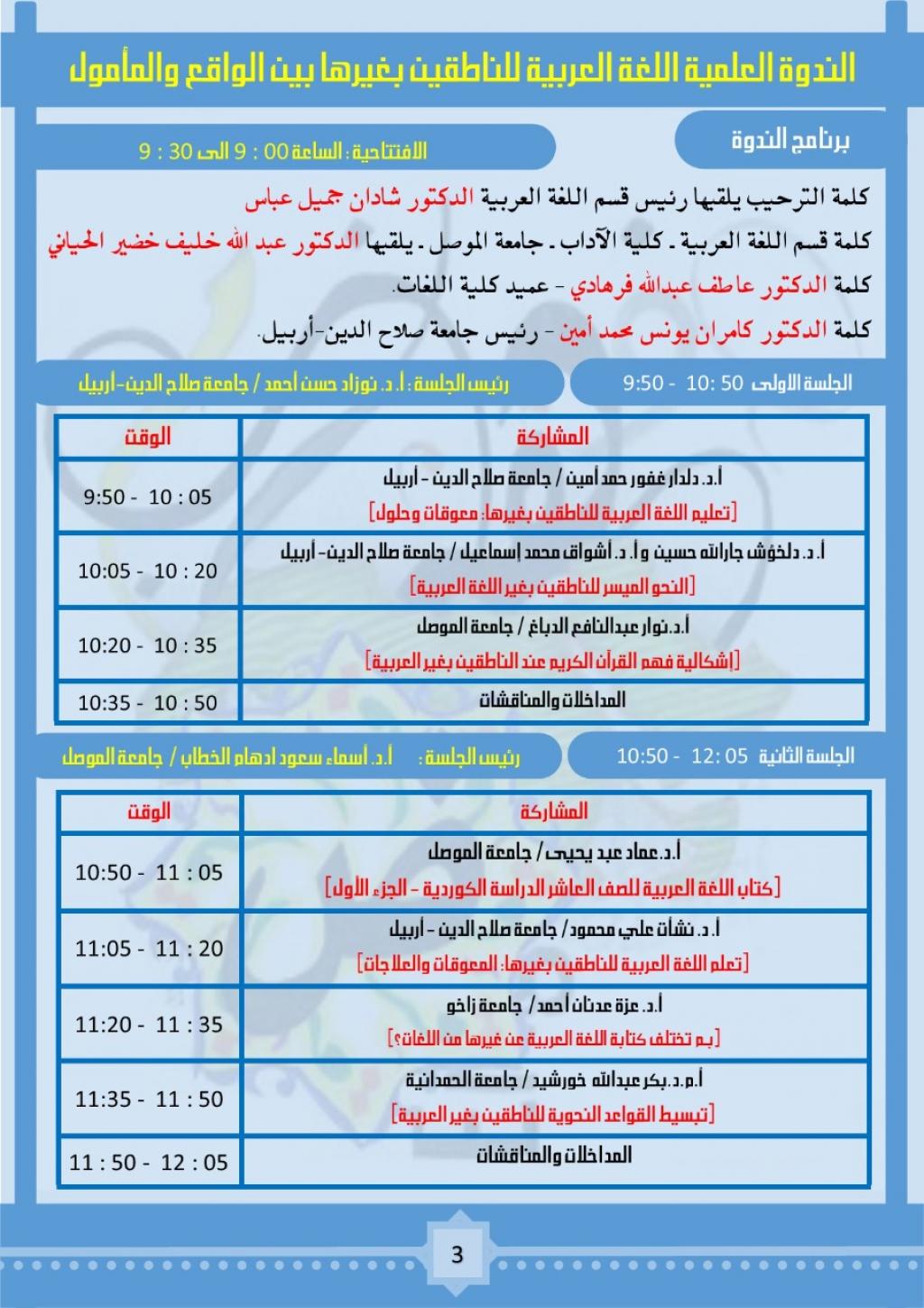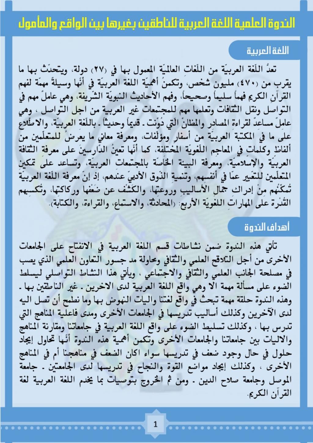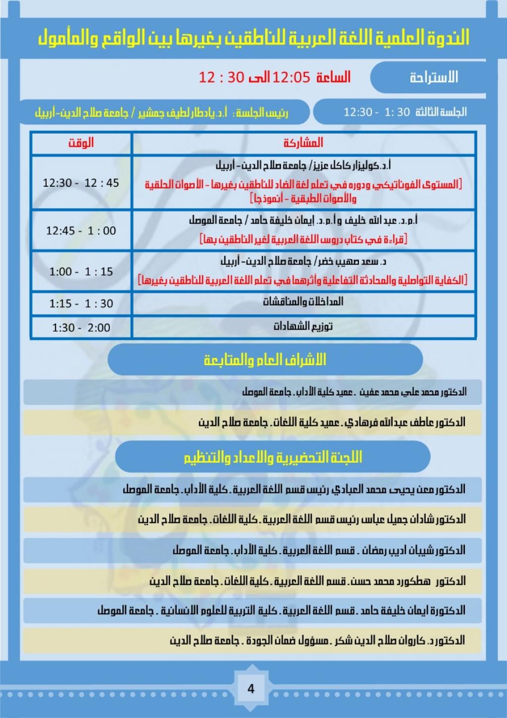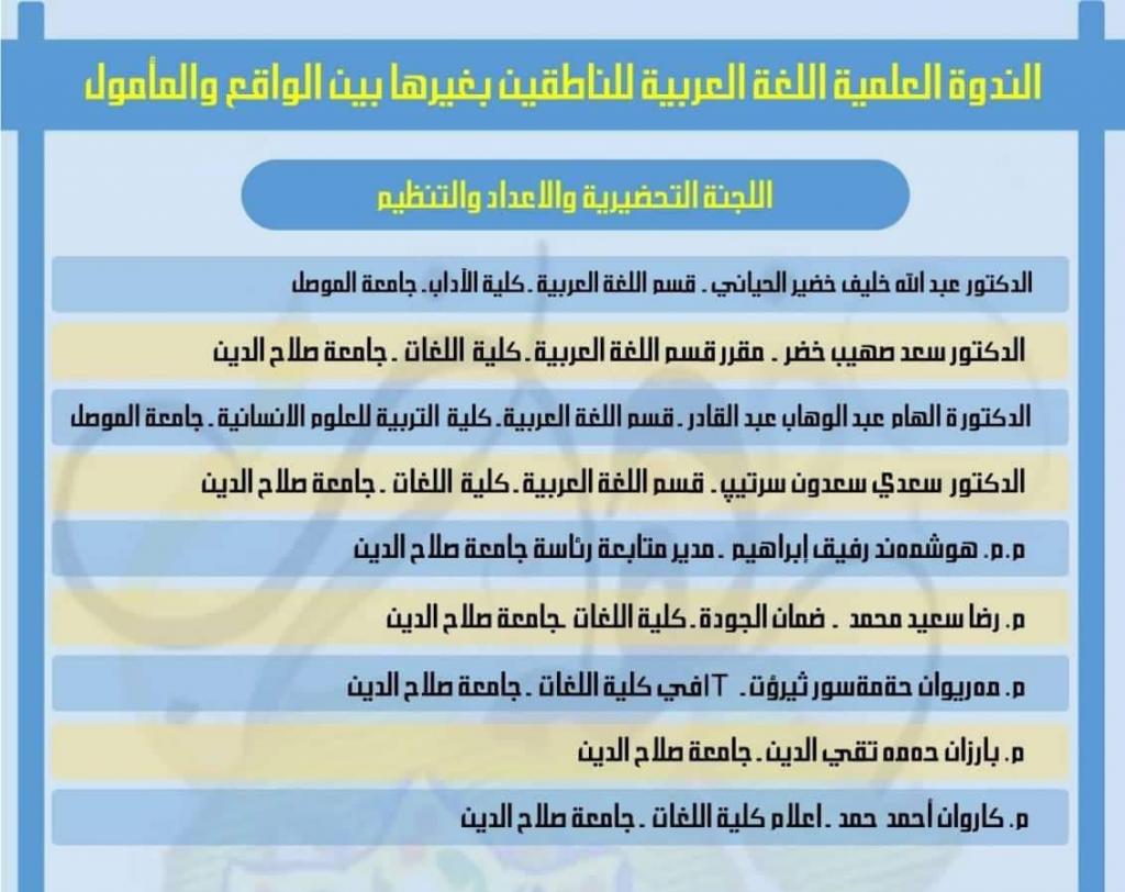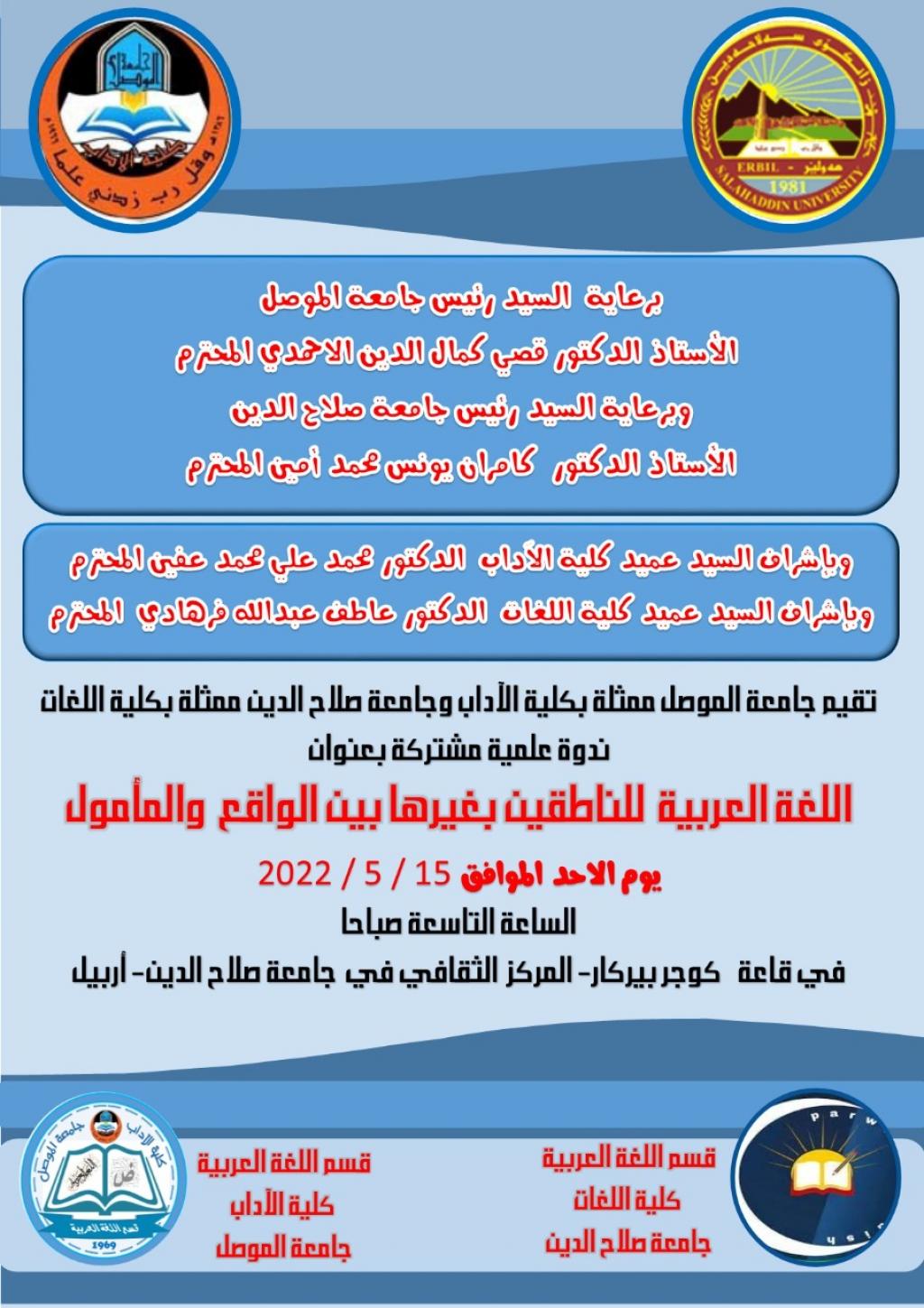 برعاية السيد رئيس جامعة الموصل الأستاذ الدكتور قصي كمال الدين الاحمدي المحترم وبرعاية السيد رئيس جامعة صلاح الدين الأستاذ الدكتور كامران يونس محمد أمين المحترم وبإشراف السيد عميد كلية الآداب الدكتور محمد علي محمد عفين المحترم وبإشراف السيد عميد كلية اللغات الدكتور عاطف عبدالله فرهادي المحترم ، تقيم جامعة الموصل ممثلة بكلية الآداب وجامعة صلاح الدين ممثلة بكلية اللغات ندوة علمية مشتركة بعنوان “اللغة العربية للناطقين بغيرها بين الواقع والمأمول” يوم الاحد الموافق 2022 / 5 / 15 الساعة التاسعة صباحا في قاعة كوجر بيركار- المركز الثقافي في جامعة صلاح الدين- أربيلاهداف الندوة:تأتي هذه الندوة ضمن نشاطات قسم اللغة العربية في الانفتاح على الجامعات الأخرى من أجل التلاقح العلمي والثقافي ومحاولة مد جسور التعاون العلمي الذي يصب في مصلحة الجانب العلمي والثقافي والاجتماعي ، ويأتي هذا النشاط التواصلي ليسلط الضوء على مسألة مهمة الا وهي واقع اللغة العربية لدى الاخرين ـ غير الناطقين بـها ـ وهذه الندوة حلقة مهمة تبحث في واقع لغتنا واليات النهوض بـها وما نطمح أن تصل اليه لدى الآخرين وكذلك أساليب تدريسها في الجامعات الأخرى ومدى فاعلية المناهج التي تدرس بـها ، وكذلك تسليط الضوء على واقع اللغة العربية في جامعاتنا ومقارنة المناهج والاليات بين جامعاتنا والجامعات الأخرى وتكمن أهمية هذه الندوة أنّـها تحاول إيجاد حلول في حال وجود ضعف في تدريسها سواء اكان الضعف في مناهجنا أم في المناهج الأخرى ، وكذلك إيجاد مواضع القوة والنجاح في تدريسها لدى الجامعتين ـ جامعة الموصل وجامعة صلاح الدين ـ ومن ثم الخروج بتوصيات بما يخدم اللغة العربية لغة القرآن الكريم.الاشراف العام : الدكتور محمد علي محمد عفين ـ عميد كلية الآداب ـ جامعة الموصلالدكتور عاطف عبدالله فرهادي ـ عميد كلية اللغات ـ جامعة صلاح الدينالمشاركون:أ.د. دلدار غفور حمد أمين / جامعة صلاح الدين – أربيل (تعليم اللغة العربية للناطقين بغيرها: معوقات وحلول)أ. د. دلَخؤش جارالله حسين و أ. د. أشواق محمّد إسماعيل / جامعة صلاح الدين- أربيل (النحو الميسّر للناطقين بغير اللغة العربية)أ.د.نوار عبدالنافع الدبّاغ / جامعة الموصل (إشكالية فهم القرآن الكريم عند الناطقين بغير العربية)أ.د.عماد عبد يحيى/ جامعة الموصل (كتاب اللغة العربية للصف العاشر الدراسة الكوردية – الجزء الأول)أ. د. نشأت علي محمود/ جامعة صلاح الدين – أربيل (تعلم اللغة العربية للناطقين بغيرها: المعوّقات والعلاجات)أ.د. عزة عدنان أحمد/ جامعة زاخو (بم تختلف كتابة اللغة العربية عن غيرها من اللغات؟)أ.م.د.بكر عبدالله خورشيد / جامعة الحمدانية (تبسيط القواعد النحوية للناطقين بغير العربية)أ.د.گوليزار كاكل عزيز/ جامعة صلاح الدين- أربيل (المستوى الفوناتيكي ودوره في تعلُّم لغة الضاد للناطقين بغيرها – الأصوات الحلقية والأصوات الطبقية – أنموذجاً)أ.م.د. عبد الله خليف خضير وأ.م.د.إيمان خليفة حامد / جامعة الموصل (قراءة في كتاب دروس اللغة العربية لغير الناطقين بها)د. سعد صهيب خضر/ جامعة صلاح الدين- أربيل (الكفاية التواصلية والمحادثة التفاعلية وأثرهما في تعلّم اللغة العربية للناطقين بغيرها)اللجنة التحضيرية : الدكتور معن يحيى محمد العبادي رئيس قسم اللغة العربية ـ كلية الآداب ـ جامعة الموصلالدكتور شادان جميل عباس رئيس قسم اللغة العربية ـ كلية اللغات ـ جامعة صلاح الدينالدكتور شيبان اديب رمضان ـ قسم اللغة العربية ـ كلية الآداب ـ جامعة الموصلالدكتور هطكورد محمّد حسن ـ قسم اللغة العربية ـ كلية اللغات ـ جامعة صلاح الدينالدكتورة ايمان خليفة حامد ـ قسم اللغة العربية ـ كلية التربية للعلوم الانسانية ـ جامعة الموصلالدكتور د. كاروان صلاح الدين شكر ـ مسؤول ضمان الجودة ـ جامعة صلاح الدينالدكتور عبد الله خليف خضير الحياني ـ قسم اللغة العربية ـ كلية الآداب ـ جامعة الموصلالدكتور سعد صهيب خضر ـ مقرر قسم اللغة العربية ـ كلية ا