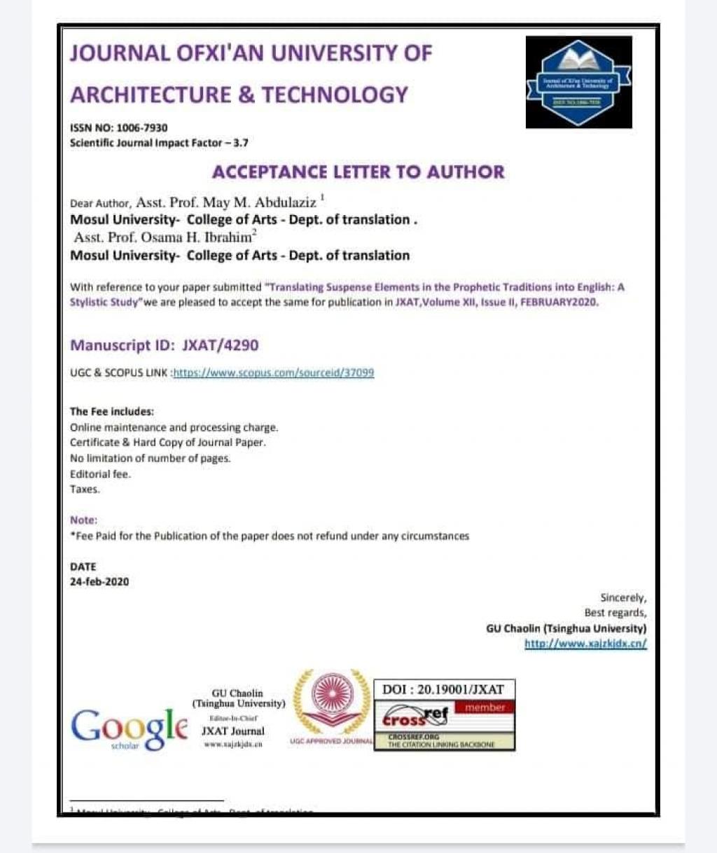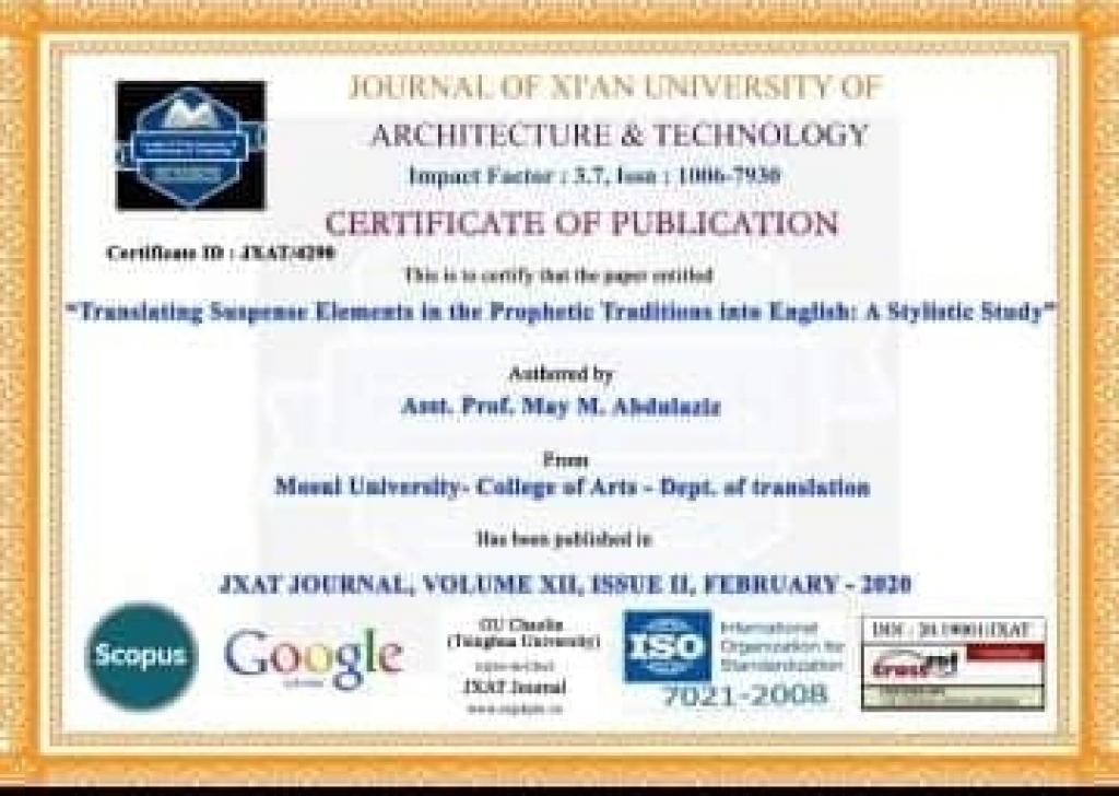 نشر الاستاذ المساعد أسامة حميد ابراهيم سلطان من قسم الترجمة بالاشتراك مع الاستاذ المساعد مي مكرم عبدالعزيز/ قسم الترجمة ـ كلية الآداب ـ جامعة الموصل بحثاَ في اختصاص الترجمة في مجلة عالمية رصينةJournal of Xian Universityضمن مستوعبات سكوبس تحت عنوانTranslating suspense elements in the prophetic traditions into English: A stylistic Studyترجمة اسلوب التشويق في الحديث النبوي الى الانكليزية: دراسة أسلوبية
