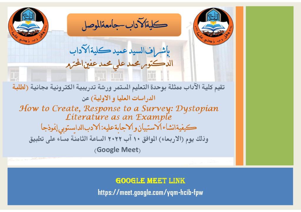 بإشراف السيد عميد كلية الآداب الاستاذ المساعد الدكتور محمد علي عفين المحترم، اقامت وحدة التعليم المستمر في كلية الآداب، ورشة تدريبية الكترونية مجانية (لطلبة الدراسات الاولية و العليا) بعنوان (How to Create, Response to a Survey: Dystopian Literature as an Example) (كيفية انشاء الاستبيان و الاجابة عليه: الادب الدايستوبي إنموذجا)، و ذلك يوم (الاربعاء) الموافق 10 آب 2022 الساعة الثامنة مساء بتوقيت بغداد على تطبيق (Google Meet).