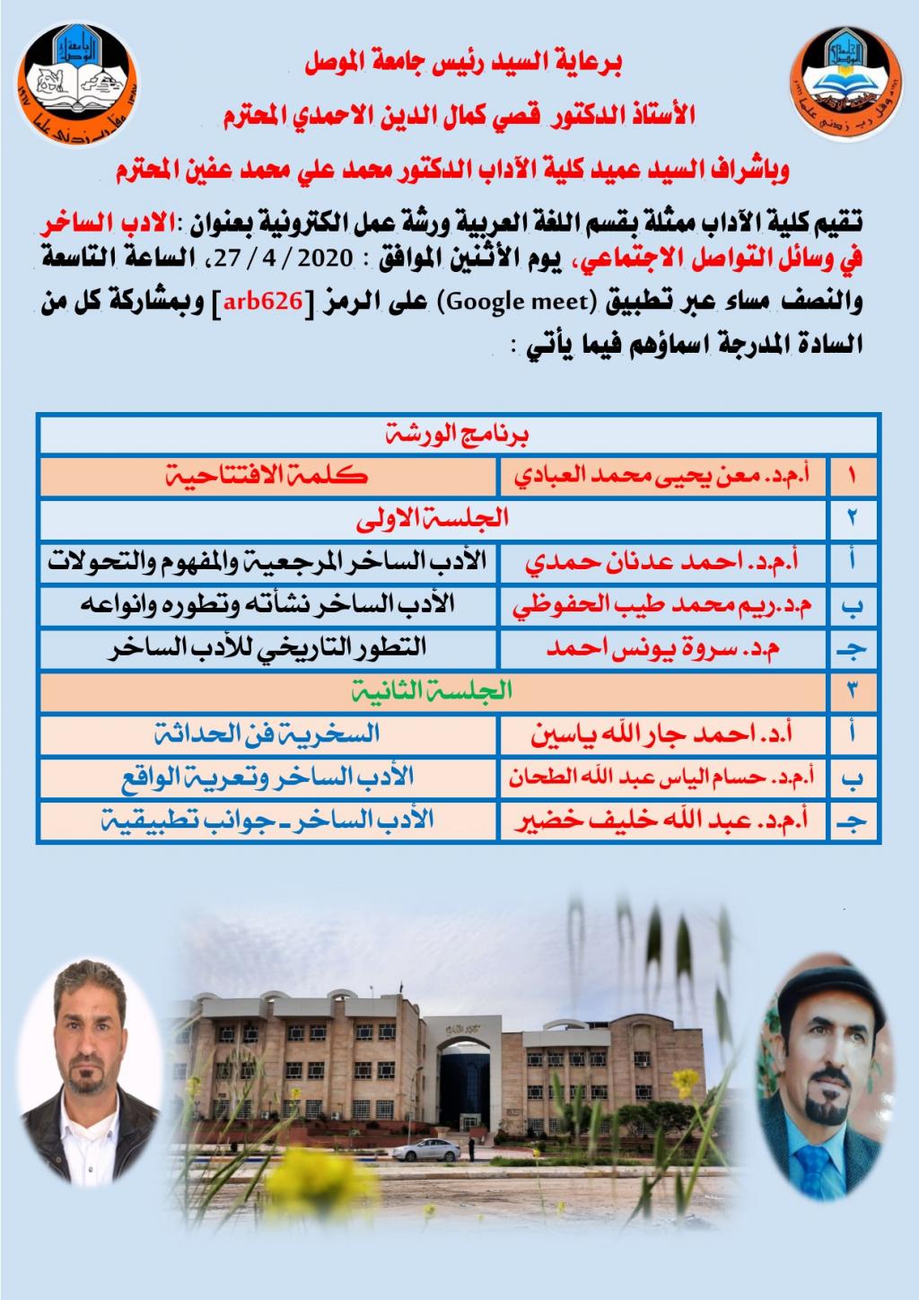 برعاية السيد رئيس جامعة الموصل الأستاذ الدكتور قصي كمال الدين الاحمدي المحترم وباشراف السيد عميد كلية الآداب الدكتور محمد علي محمد عفين المحترماقامت كلية الآداب ممثلة بقسم اللغة العربية ورشة عمل الكترونية بعنوان :الادب الساخر في وسائل التواصل الاجتماعي، يوم الأثنين الموافق : 27 / 4 / 2020، الساعة التاسعة والنصف مساء عبر تطبيق (Google meet) ، ادار الورشة أ.م.د. عبد الله خليف خضير الحياني ، وشهدت الورشة حضورا كبيرا من محافظات العراق ، وشهدت الورشة مناقشات ومداخلات قيمة واستمرت لأكثر من ساعتين ونصف ، وشارك في الورشة كل من :1 أ.م.د. معن يحيى محمد العبادي كلمة الافتتاحية2 الجلسة الاولىأ أ.م.د. احمد عدنان حمدي الأدب الساخر المرجعية والمفهوم والتحولاتب م.د.ريم محمد طيب الحفوظي الأدب الساخر نشأته وتطوره وانواعهجـ م.د. سروة يونس احمد التطور التاريخي للأدب الساخر3 الجلسة الثانيةأ أ.د. احمد جار الله ياسين السخرية فن الحداثةب أ.م.د. حسام الياس عبد الله الطحان الأدب الساخر وتعرية الواقعجـ أ.م.د. عبد الله خليف خضير الأدب الساخر ـ جوانب تطبيقية