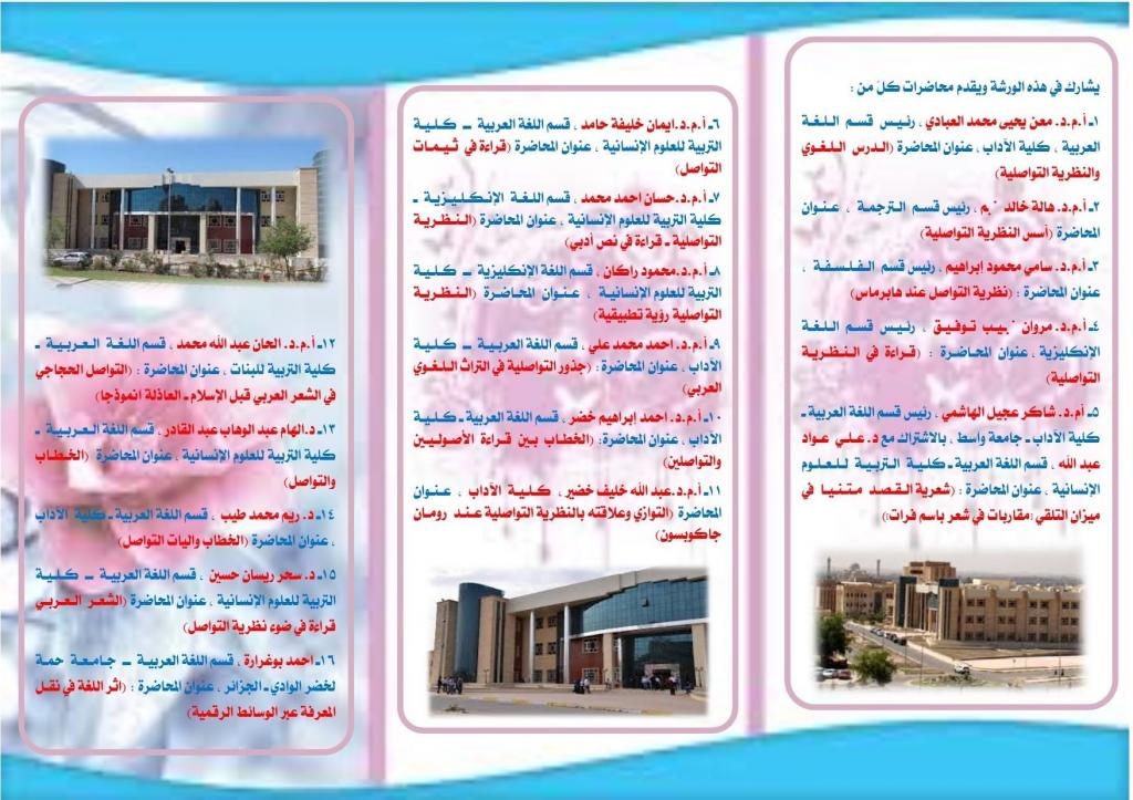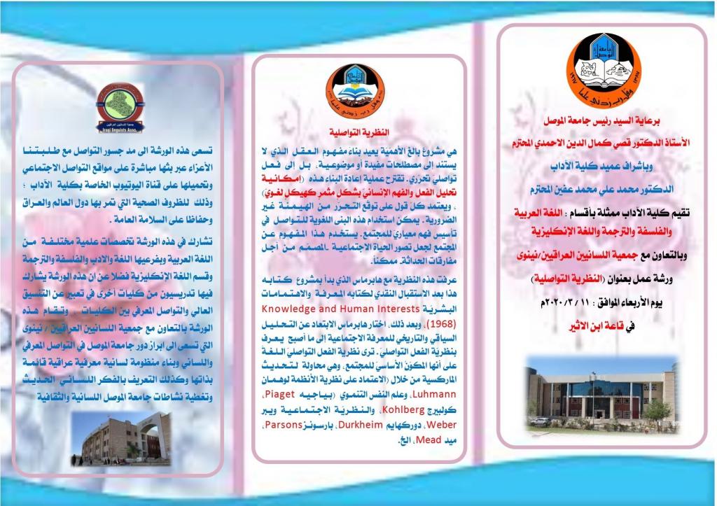 برعاية السيد رئيس جامعة الموصل الأستاذ الدكتور قصي كمال الدين الاحمدي المحترم وبحضور السيد مساعد رئيس الجامعة للشؤون العلمية الأستاذ الدكتور منير سالم طه المحترم وبإشراف عميد كلية الآداب الدكتور محمد علي محمد عفين المحترم اقامت كلية الآداب ممثلة بأقسام : اللغة العربية والفلسفة والترجمة واللغة الإنكليزية وبالتعاون مع جمعية اللسانيين العراقيين/نينوى ورشة عمل بعنوان (النظرية التواصلية) اليوم الأربعاء الموافق: 11 / 3/ 2020 في قاعة ابن الاثير ، ونظرا للظروف الصحية التي تمر بها دول العالم والعراق وحفاظا على السلامة العامة نقلت هذه الورشة عبر البث المباشر في موقع الكلية كما تم تسجيلها فيديو وستحمل على الموقع الكلية في اليوتيوب ، شهدت المحاضرات مداخلات علمية وملاحظات رصينة قدمها الأستاذ الدكتور منير سالم طه وكذلك عميد كلية الآداب أ.م.د.محمد علي محمد عفين ، وحضر الورشة كل من معاون عميد كلية الآداب للشؤون العلمية الأستاذ الدكتور حارث حازم أيوب والسيدة نهاد محمد عاشور معاون الكلية للشؤون الإدارية والدكتور جمعة جاسم رئيس قسم الاعلام وكان للدكتور حسن راشد رئيس قسم الاجتماع مداخلات علمية رصينة ووجهة نظر تمثل الرؤية الاجتماعية لنظرية التواصل قدم المحاضرات كل من :1ـ أ.م.د.حسان مؤيد حامد ، قسم اللغة الإنكليزية ـ كلية التربية للعلوم الإنسانية ، عنوان المحاضرة (النظرية التواصلية ـ قراءة في نص أدبي)2ـ م.م.محمود راكان احمد ، قسم اللغة الإنكليزية ـ كلية التربية للعلوم الإنسانية ، عنوان المحاضرة (النظرية التواصلية رؤية تطبيقية)3ـ أ.م.د.عبد الله خليف خضير ، كلية الآداب ، عنوان المحاضرة (التوازي وعلاقته بالنظرية التواصلية عند رومان ياكوبسون)4ـ أ.م.د.ايمان خليفة حامد ، قسم اللغة العربية ـ كلية التربية للعلوم الإنسانية ، عنوان المحاضرة (قراءة في ثيمات التواصل)5ـ د.الهام عبد الوهاب عبد القادر ، قسم اللغة العربية ـ كلية التربية للعلوم الإنسانية ، عنوان المحاضرة (الخطاب والتواصل)