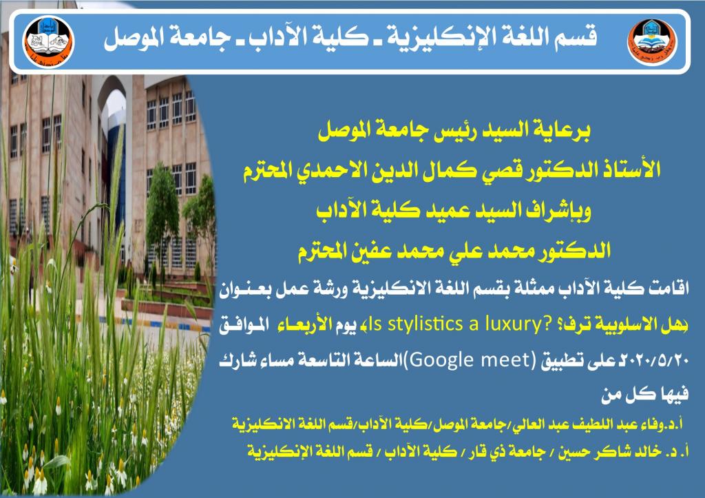 برعاية السيد رئيس جامعة الموصل الأستاذ الدكتور قصي كمال الدين الاحمدي المحترموبإشراف السيد عميد كلية الآداب الدكتور محمد علي محمد عفين المحترماقامت كلية الآداب ممثلة بقسم اللغة الانكليزية ورشة عمل بعنوان (هل الاسلوبية ترف؟ Is stylistics a luxury?) يوم الأربعاء الموافق ٢٠٢٠/5/20 على تطبيق (Google meet)الساعة التاسعة مساء تناولت الورشة قضية مهمة الا وهي الاسلوبية ذلك انها تدرس لطلبة الدراسات العليا في اقسام عدة مها اللغة الانكليزية والعربية ومع انها امتدت لسنوات عدة الا انها حافظت على وجودها اذ تعد الأسلوبية من الدعائم الأساسية قديما وحديثا ، قديما ظهرت في البلاغة العربية وحديثا ظهرت في علم اللغة أو اللسانيات الحديثة وقد شهد علم الأسلوب كمختلف التيارات النقدية الحديثة تحولات عديدة منذ بدايات ظهوره الأولى ، مما أدى الى احتكاكه ببعض المفاهيم النقدية واحتوائه فيها أحيانا وقد حاولت مدارس عديدة بدورها احتواء هذا العلم ، أو احتضانه ضمن أطرها الضيقة، فجاءت هذه الورش لتسلط الضوء على الاسلوبية وتكشف واقعه ولا سيما تدريسه في الدراسات العليا وانطلق الورشة من سؤال مهم : (هل الاسلوبية ترف؟ Is stylistics a luxury?)شارك فيها كل من أ.د.وفاء عبد اللطيف عبد العالي/جامعة الموصل/كلية الآداب/قسم اللغة الانكليزيةأ. د. خالد شاكر حسين / جامعة ذي قار / كلية الآداب / قسم اللغة الإنكليزية