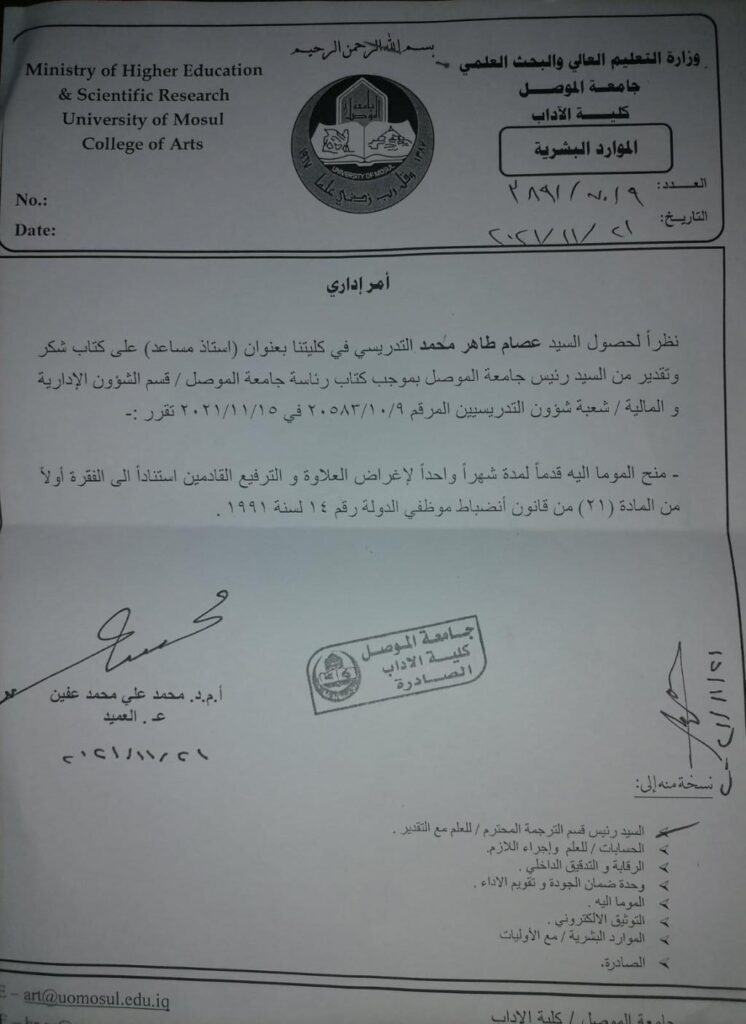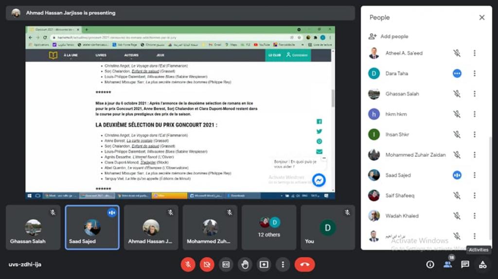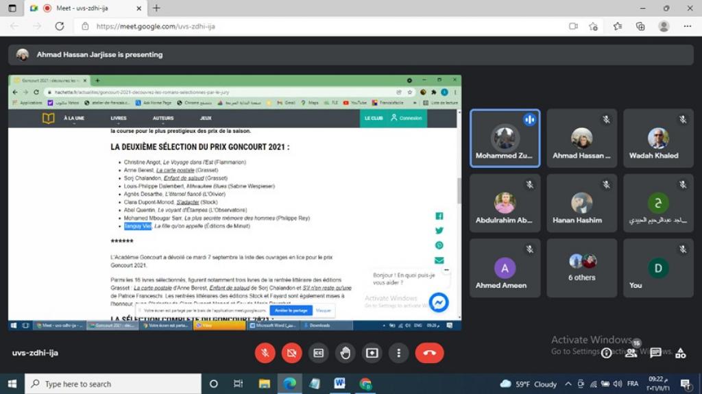 بأشراف السيد عميد كلية الآداب الاستاذ المساعد الدكتور محمد علي عفين المحترم ومتابعة السيد رئيس قسم اللغة الفرنسية المدرس أحمد أمين توفيق المحترم وفي اطار التعاون المشترك بين جامعة الموصل والوكالة الجامعية الفرانكوفونية/ مكتب الشرق الاوسط في بيروت، أقام قسم اللغة الفرنسية يوم (الاحد) الموافق 21 تشرين الثاني 2021 في الساعة التاسعة مساءا ورشة عمل الكترونية حول “مناقشة الروايات المشاركة في مسابقة جائزة جونكور/ اختيار الشرق.”هدفت الورشة الى تقديم تسعة نصوص روائية اختارتها لجنة الجونكور العليا المشرفة على منح الجائزة في تصفيتها الثانية وتم تحليل هذه النصوص وفقا لجدول معتمد في تقييم الروايات المشاركة في هذه المسابقة ,يتضمن هذا الجدول موضوع الرواية و اسلوب الكاتب ومستوى لغة كتابة الرواية بالإضافة الى السيرة الذاتية للمؤلف و تصميم الكتاب.تخللت الورشة مداخلات من تدريسي القسم ساهمت في اثراء النقاش. كما وسيمثل جامعة الموصل للمشاركة في لجنة تحكيم الروايات في بيروت طالبة الماجستير (حنين ماجد عبدالرحيم) بإشراف الاستاذ المساعد أحمد حسن جرجيس.شارك في تقديم الورشة كلا الاستاذ المساعد الدكتور محمد زهير زيدان، الاستاذ المساعد الدكتورة الهام حسن سلو، الاستاذ المساعد أحمد حسن جرجيس، المدرس المساعد عبدالرحيم عبد الرحيم محمد أمين ، المدرس المساعد سعد ساجد فتاح، المدرس المساعد غسان صلاح جار الله، المدرس المساعد سيف عدنان شفيق و المدرس زهراء مؤيد عباس.