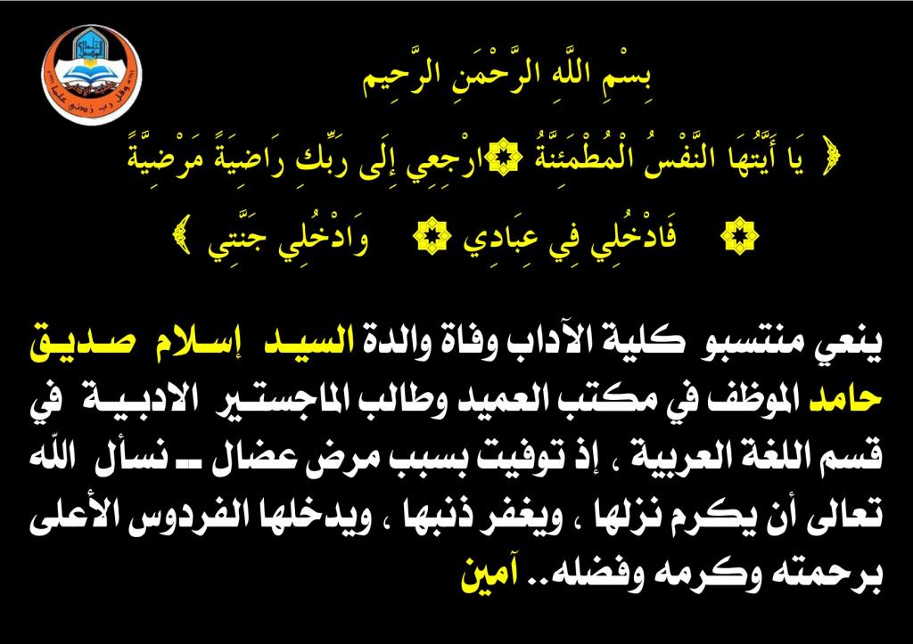 بمزيد من الأسى والحزن ينعي منتسبو كلية الآداب وفاة والدة السيد (إسلام صديق حامد) الموظف في مكتب العميد وطالب الماجستير الأدبية في قسم اللغة العربية. نسأل الله تعالى أن يتغمدها برحمته وينزلها منزل الصديقين. ويغسلها بالماء والثلج والبرد. (إنّا لله و إنَّا إليه راجعون)