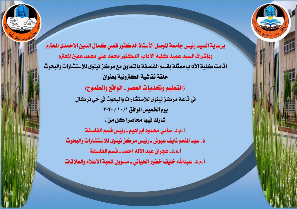 وقائع الحلقة النقاشية الالكترونية (التعليم وتحديات العصر – الواقع والطموح) ، قسم الفلسفة ـ كلية الآداب ـ جامعة الموصل بالتعاون مع مركز نينوى للاستشارات والبحوث ، يوم خميس الموافق 1/ 10 / 2020 ، شارك فيها محاضرا كل من : أ.م.د. سامي محمود ابراهيم ـ رئيس قسم الفلسفة ، ود. عبد المنعم نايف عبوش ـ رئيس مركز نينوى للاستشارات والبحوث ، وأ.م.د. هجران عبد الاله احمد ـ قسم الفلسفة ، وأ.م.د. عبدالله خليف خضير الحياني ـ مسؤول شعبة الاعلام والعلاقاتلمتابعة الحلقة يرجى زيارة الرابط الاتيhttps://www.youtube.com/watch?v=s0v0JXsNggM&feature=youtu.be&fbclid=IwAR05h5_WoumezgemhLpx2P3Lmj-3V6JWxo5tmc3RrPNL0iJB3ciDFWNOp4Y