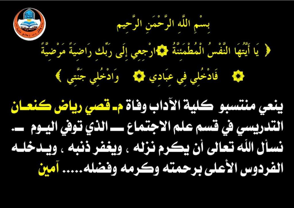 ينعي منتسبو كلية الآداب وفاة م. قصي رياض كنعان التدريسي في قسم علم الاجتماع