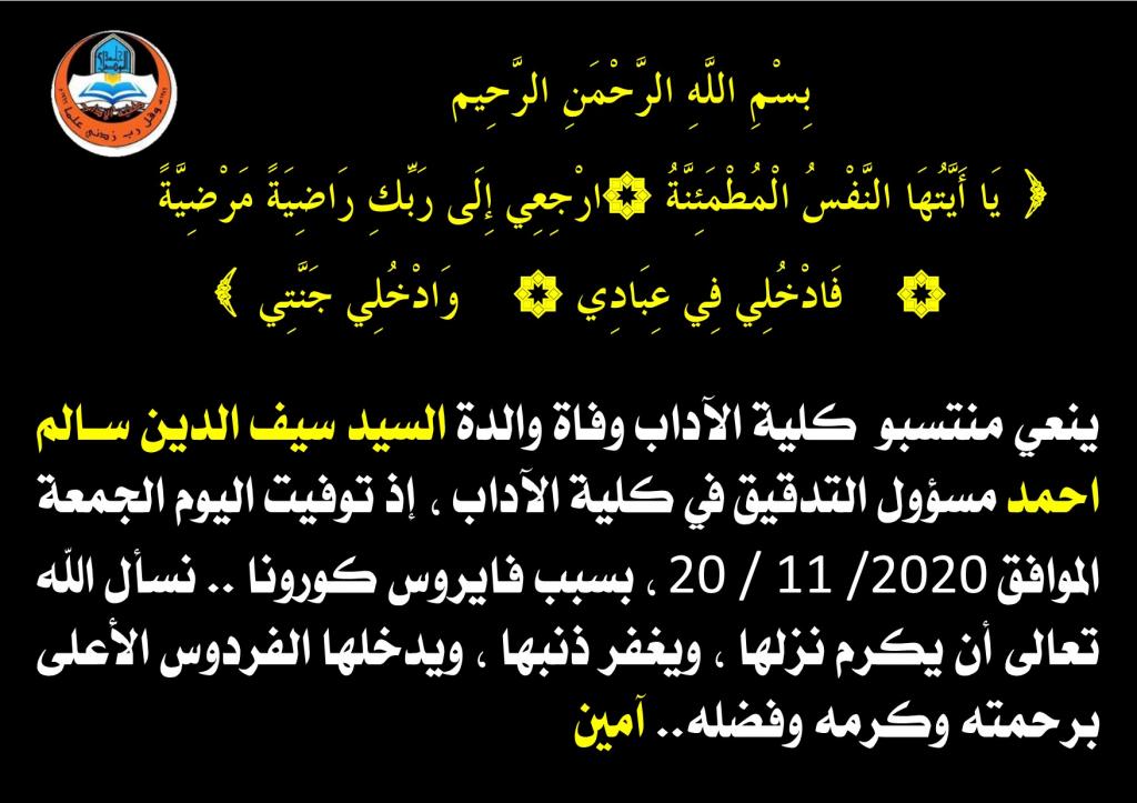 ينعي منتسبو كلية الآداب وفاة والدة السيد سيف الدين سالم احمد مسؤول التدقيق في كلية الآداب ، إذ توفيت اليوم الجمعة الموافق 20 / 11 /2020 ، بسبب فايروس كورونا .. نسأل الله تعالى أن يكرم نزلها ، ويغفر ذنبها ، ويدخلها الفردوس الأعلى برحمته وكرمه وفضله.. آمين