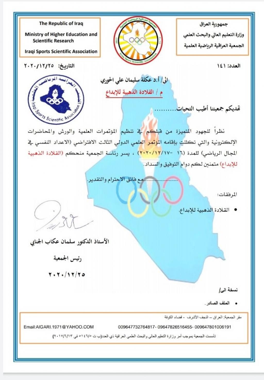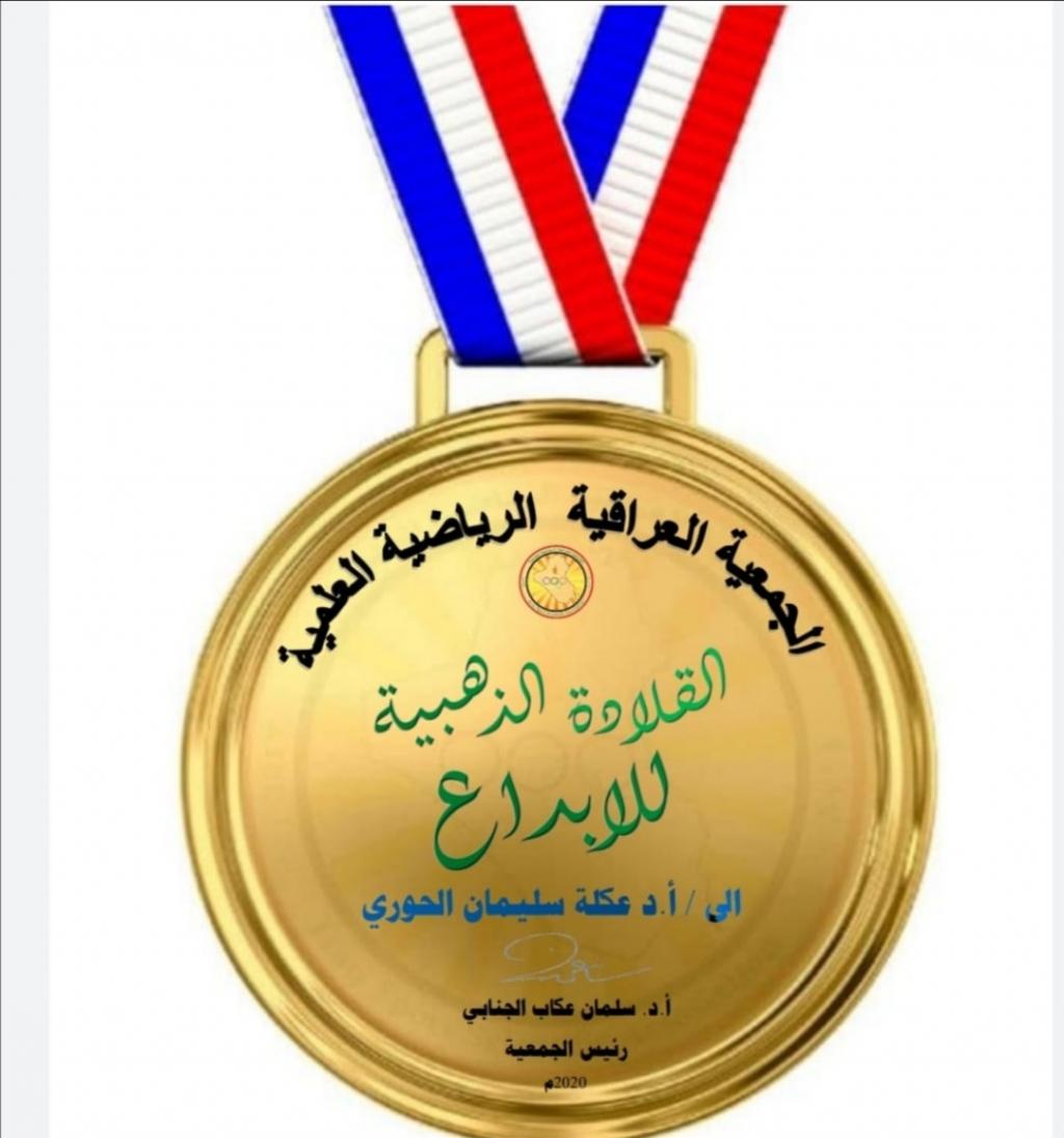 حصل الاستاذ الدكتور عكلة سليمان الحوري رئيس فرع علم النفس الريا ضي في الجمعية العراقية الرياضية والتدريسي في قسم التربية البدنية وعلوم الرياضة في كلية التربية الاساسية على القلادة الذهبية للابداع من السيد رئيس الجمعية العراقية الرياضية نظراً للجهود المتميزة من قبله في تنظيم المؤتمرات العلمية والورش والمحاضرات الالكترونية والتي تكللت بإقامة المؤتمر العلمي الدولي الثالث الافتراضي ( الاعداد النفسي في المجال الرياضي ) للمدة ( 16 – 17 /12/2020 ) .