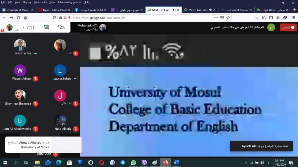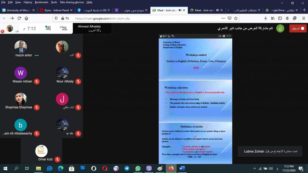 قسم اللغة الانكليزية في كلية التربية الاساسية يقيم ورشة عمل علمية افتراضية حول ادوات التعريف والتنكير