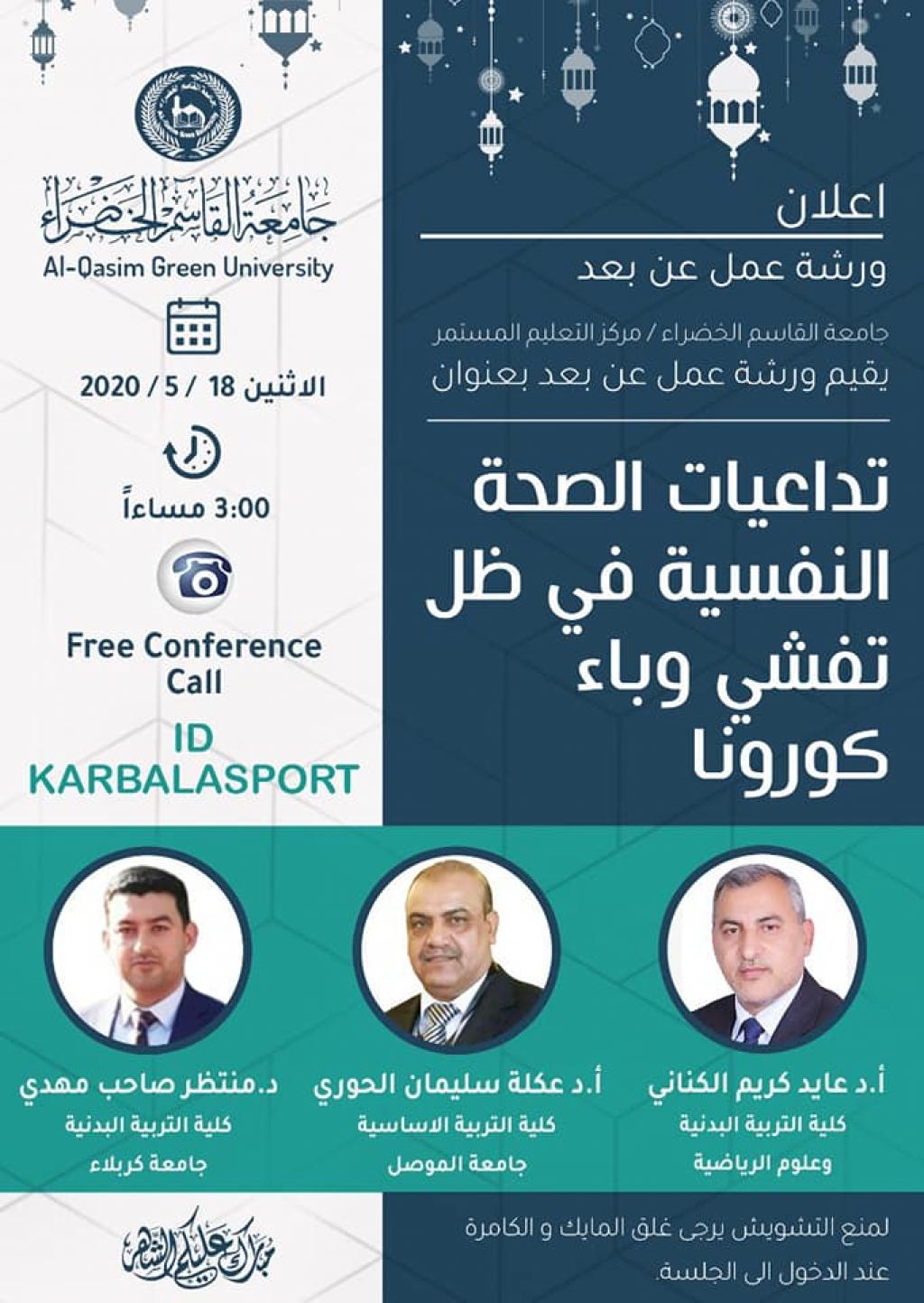 القى الاستاذ الدكتور عكلة سليمان الحوري التدريسي في قسم التربية البدنية وعلوم الرياضة في كلية التربية الاساسية محاضرة علمية قيمة في مشاركته بالورشة العلمية الدولية التي أقامتها جامعة القاسم الخضراء وعلى منصتها الافتراضية يوم الاثنين الموافق 18/5/2020 بعنوان ( تداعيات الصحة النفسية في ظل تفشي وباء كورونا ) .