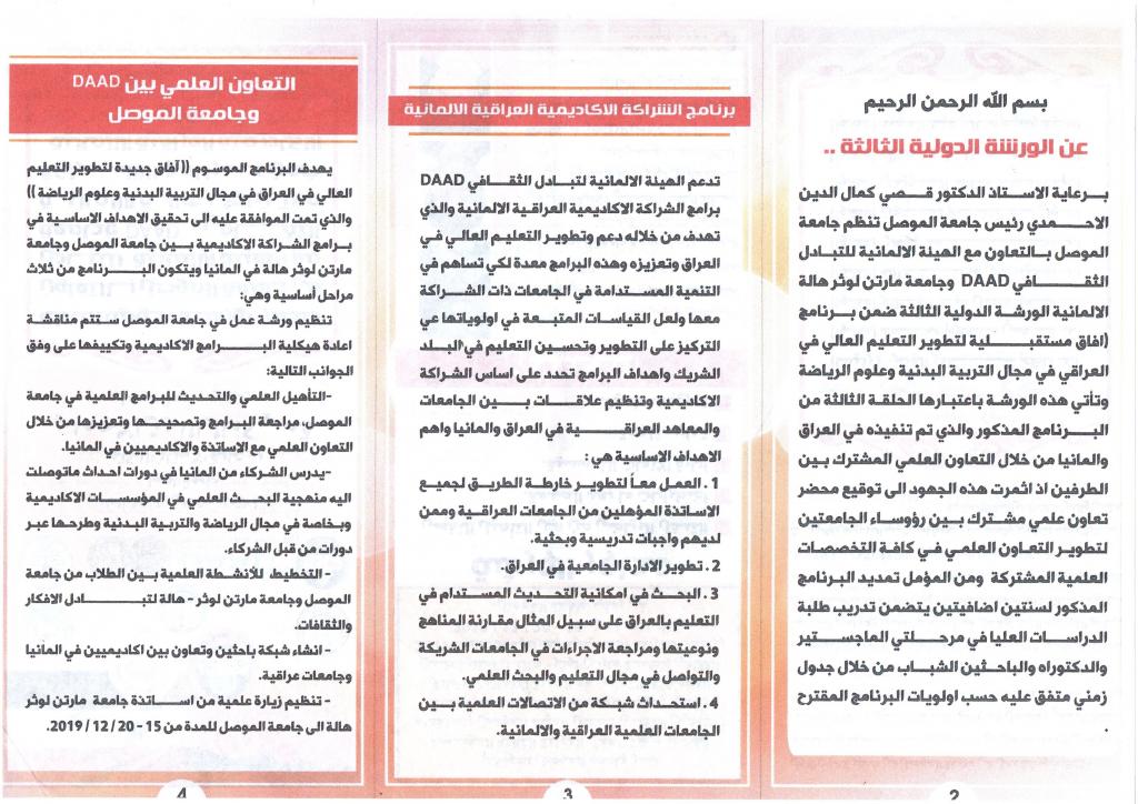برعاية أ.د. قصي كمال الدين الاحمدي رئيس جامعة الموصل وبحضور أ.د. محمد توفيق عثمان عميد كلية التربية الاساسية والدكتور محمد يونس صالح معاون العميد للشؤون العلمية و و أ.م.د صفاء الدين سليمان أ.د. قصي حازم محمد رئيس قسم التربية البدنية وعلوم الرياضة و أ.د. عكلة سليمان الحوري أ.د. سعد فاضل عبد القادر رئيس قسم رياض الاطفال وجمع غفير من تدريسيي كليات جامعة الموصل اقيمت ولليوم الثاني وفي القاعة الرياضية في كلية التربية الاساسية الورشة الدولية الثالثة في جامعة الموصل وبالتعاون مع الهيئة الالمانية للتبادل الثقافي DAAD وجامعة مارتن لوثر – هالة الالمانية ضمن برنامج الشراكة الاكاديمية العراقية الالمانية 2019 وذلك للمدة من 15 – 20/12/2019 حيث كانت الجلسة العلمية برئاسة أ.دز عكلة سليمان الحوري ومقرر الجلسة أ.د. وليد غانم ..
