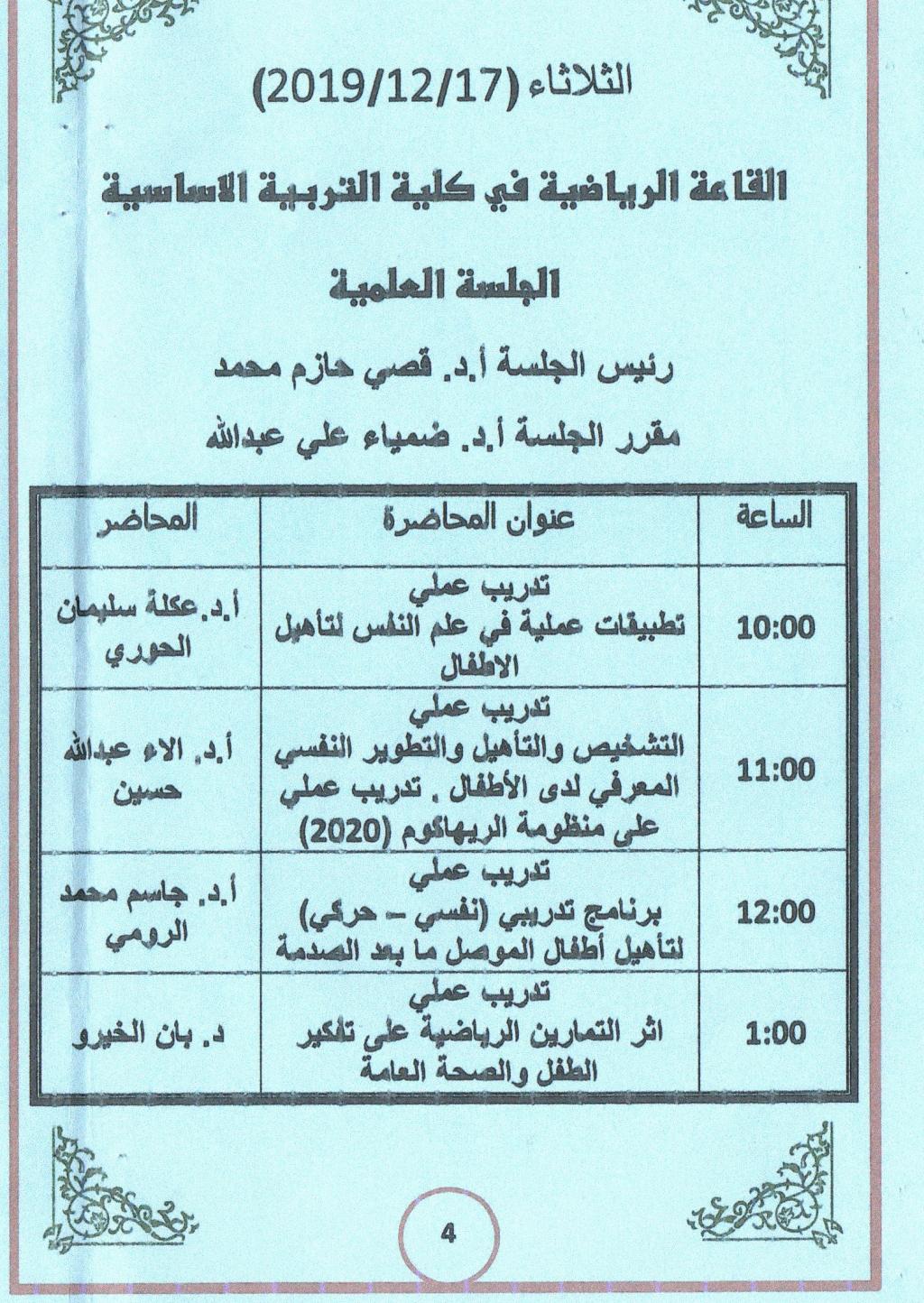 باشراف أ.د. محمد توفيق عثمان عميد كلية التربية الاساسية وحضور الدكتور محمد يونس صالح معاون العميد للشؤون العلمية والاستاذ الدكتور سعد فاضل عبد القادر رئيس قسم رياض اطفال افتتحت الورشة الدولية يومها الثالث وبالتعاون مع الهيئة الالمانية للتبادل الثقافي DAAD وجامعة مارتن لوثر هالة ،في القاعة الرياضية لكلية التربية الاساسية حيث كانت الجلسة العلمية برئاسة أ.د. قصي حازم محمد ومقرر الجلسة أ.د. ضمياء علي عبد الله وذلك يوم الثلاثاء الموافق 17/12/2019 .