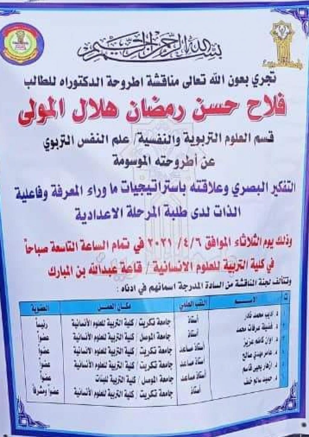 نوقشت في كلية التربية للعلوم الانسانية قسم العلوم التربوية والنفسية / جامعة تكريت يوم الثلاثاء الموافق 6/4/2021 اطروحة الدكتوراه للطالب ( فلاح حسن رمضان المولى ) التدريسي في قسم رياض الاطفال في كلية التربية الأساسية والموسومة (التفكير البصري وعلاقته بإستراتيجيات ما وراء المعرفة وفاعلية الذات لدى طلبة المرحلة الإعدادية) ،