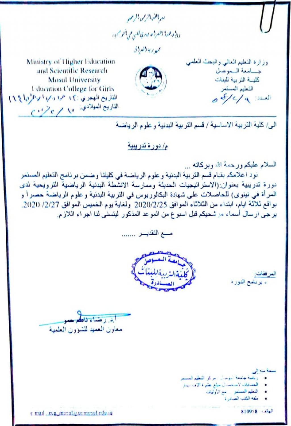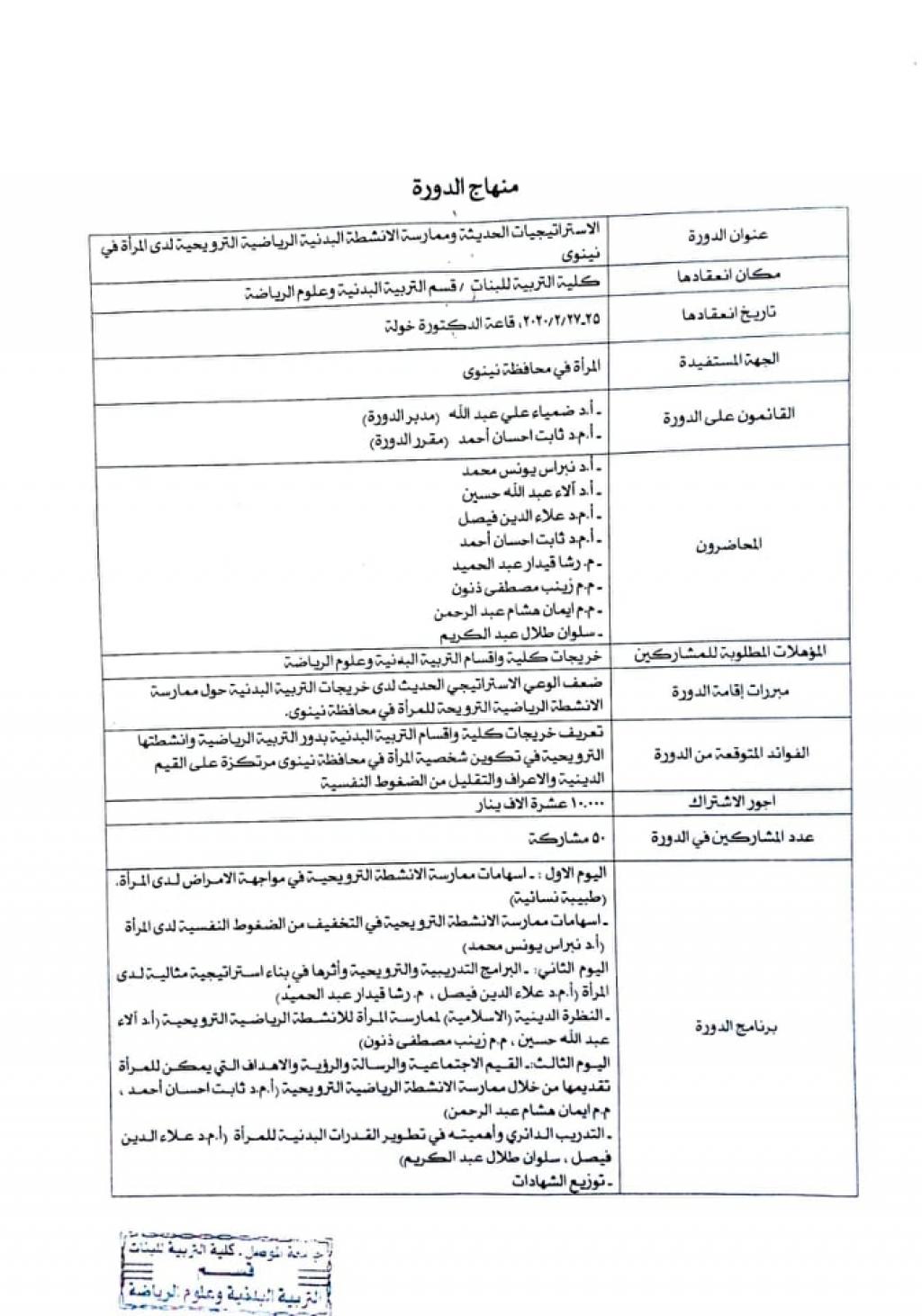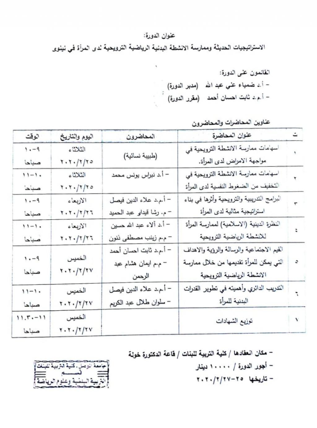 تقيم كلية التربية بنات دورة تدريبية بعنوان ( الاســــتراتيجيــــات الحديثــــــة وممارســـــة الانشطة البدنية الرياضية الترويجية لدى المرأة في نينوى ) للحاصلات على شهادة البكالوريوس في التربية البدنية وعلوم الرياضة حصراً وبواقع ثلاثة ايام ، ابتداءاً من الثلاثاء الموافق 25/2/2020 ولغاية يوم الخميس الموافق 27/2/2020 .
