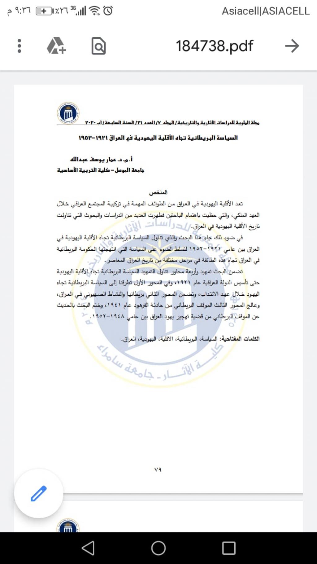 تم نشر بحث للاستاذ المساعد الدكتور عمار يوسف عبد الله من قسم التاريخ في كلية التربية الاساسية في مجلة الملوية للدراسات الاثارية والتاريخية للمجلد 7 / العدد 31 / للسنة السابعة / أب 2020 ، فهي مجلة علمية فصلية محكمة صدر عن كلية الآثار في جامعة سامراء وعنوان البحث ( السياسة البريطانية تجاه الأقلية اليهودية في العراق 1931 – 1953 ) .