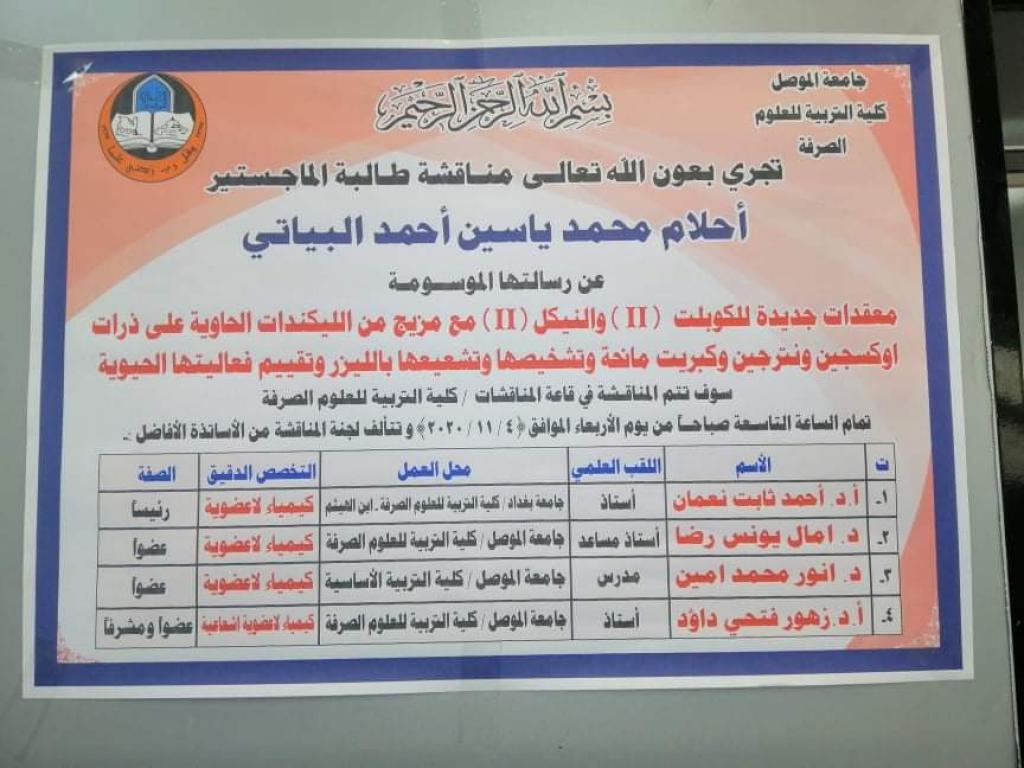 شارك الدكتور أنور محمد امين من قسم العلوم العامة – كلية التربية الأساسية في لجنة مناقشة رسالة ماجستير للطالبة ( أحلام محمد ياسين احمد البياتي ) عن رسالتها الموسومة ( معقدات جديدة للكوبلت ( 2 ) والنيكل ( 2 ) مع مزيج من الليكندات الحاوية على ذرات اوكسجين ونتروجين وكبريت مانحة وتشخيصها وتشبعها بالليزر وتقييم فعاليتها الحيوية ، وجرت المناقشة بالساعة التاسعة من يوم الأربعاء الموافق 4/11/2020 في قاعة المناقشات في كلية التربية للعلوم الصرفة .