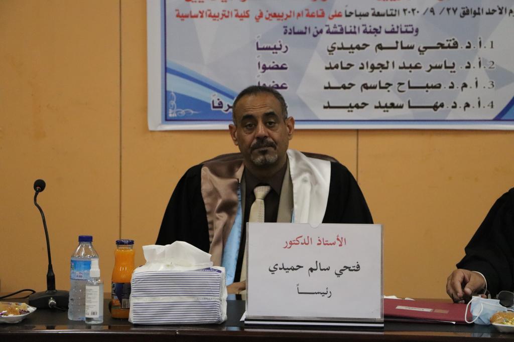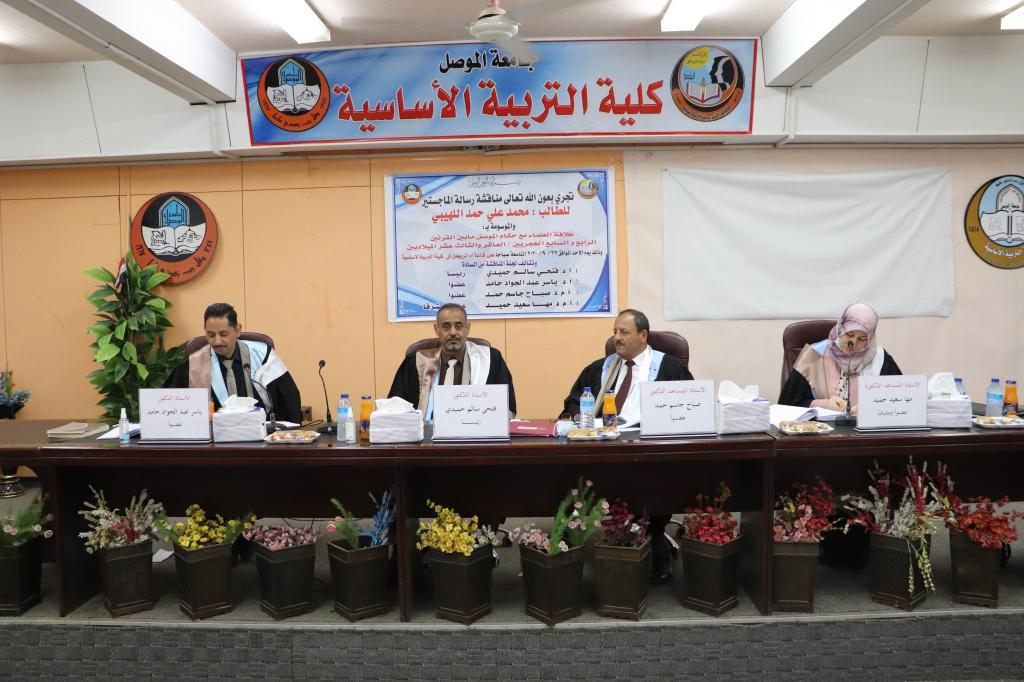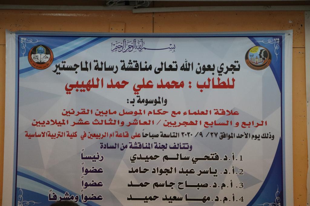 بحضور السيد عميد كلية التربية الاساسية الاستاذ الدكتور صفاء الدين عبد الله سليمان تمت صباح يوم الاحد الموافق 27/9/2020 مناقشة طالب الماجستير ( محمد علي حمد اللهيبي ) من قسم التاريخ في كلية التربية الاساسية عن رسالته الموسومة ( علاقة العلماء مع حكماء الموصل مابين القرنين الرابع والسابع الهجريين / العاشر والثالث عشر الميلاديين ) . وحضر المناقشة معاوني العميد العلمي والإداري الأستاذ الدكتور محمد توفيق عثمان ال حسين والدكتور محمد يونس صالح وجرت المناقشة على قاعة ام الربيعين في الكلية.وتألفت لجنة المناقشة من السادة التالية اسماءهم في أدناه :