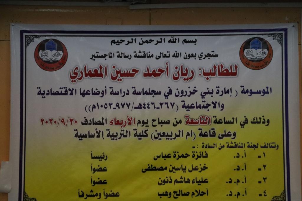 بحضور السيد عميد كلية التربية الاساسية الاستاذ المساعد الدكتور صفاء الدين عبد الله سليمان تمت صباح يوم الاربعاء الموافق 30/9/2020 مناقشة طالب الماجستير ( ريان احمد حسين المعماري) من قسم التاريخ في كلية التربية الاساسية عن رسالته الموسومة (إمارة بني خزرون في سجلماسة دراسة أوضاعها الاقتصادية والاجتماعية ( 367 – 446 هـ / 977 – 1053م ) ) ، وحضر المناقشة الأستاذ الدكتور محمد توفيق عثمان توفيق ال حسين معاون العميد للشؤون العلمية والدكتور محمد يونس صالح معاون العميد للشؤون الإدارية وتألفت لجنة المناقشة من السادة التالية اسماءهم في أدناه :