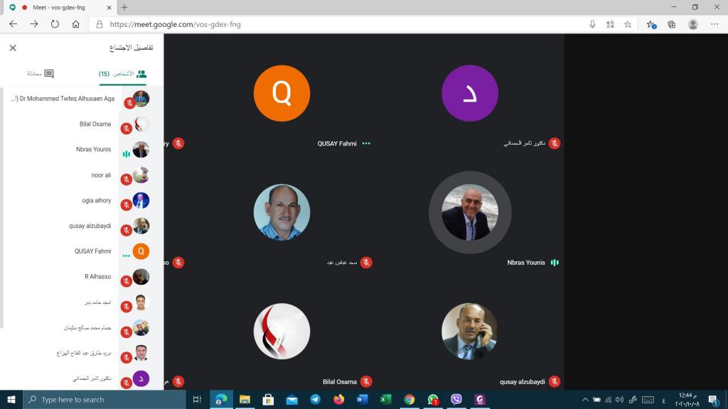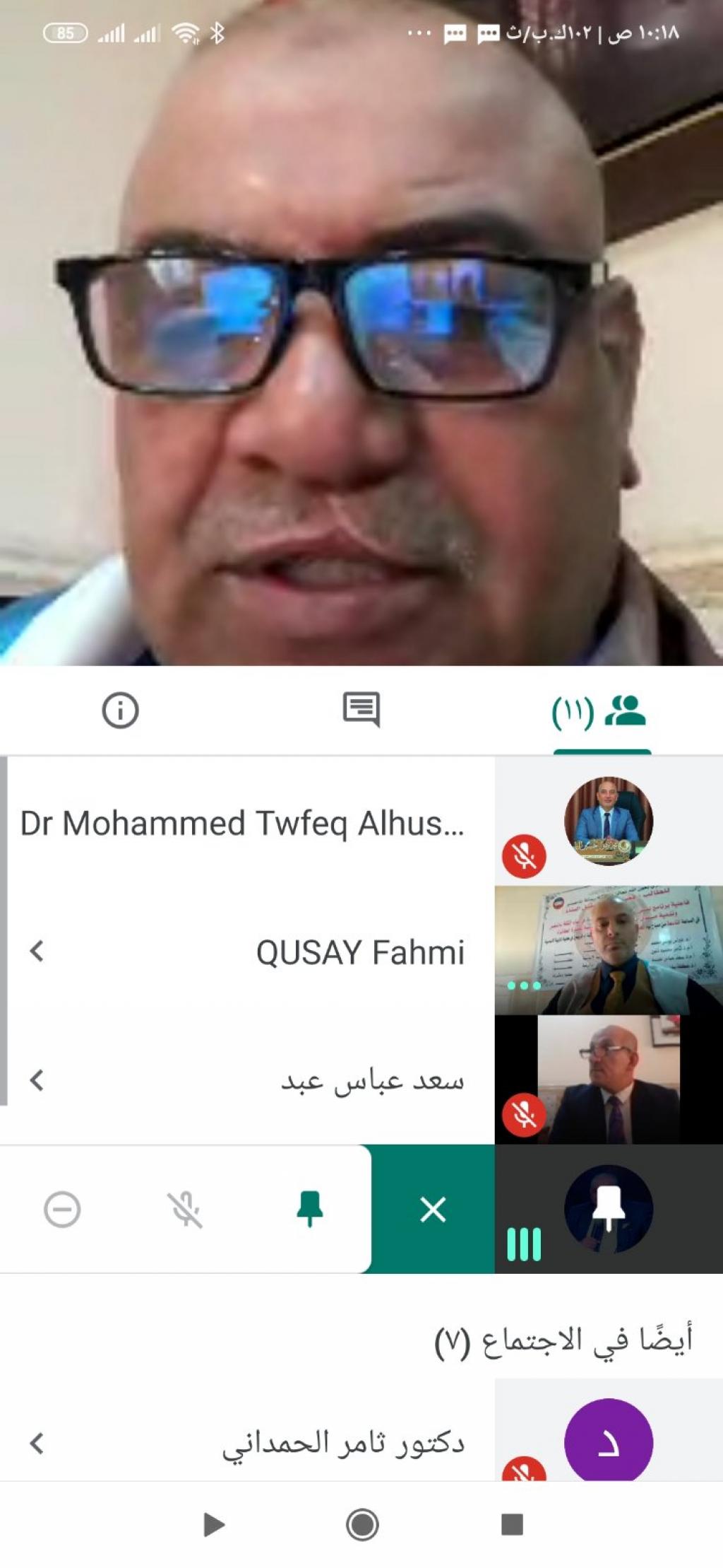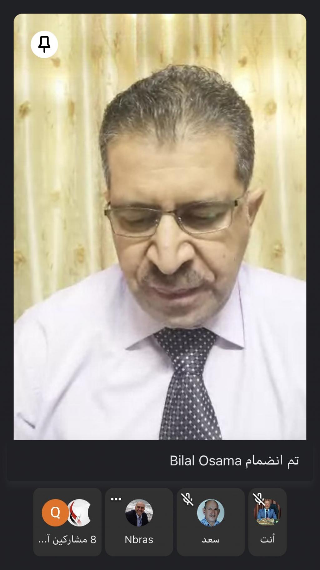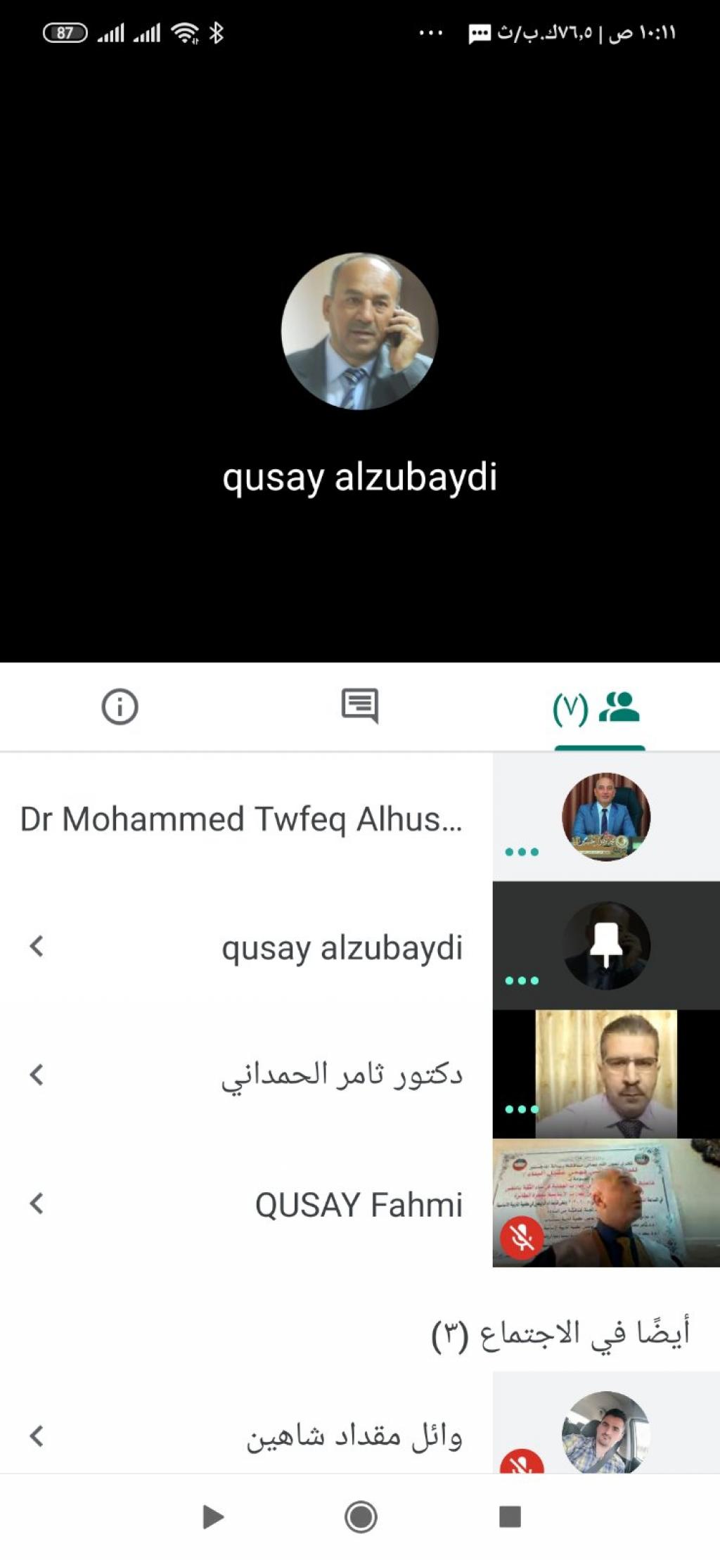 السيد عميد كلية التربية الاساسية يحضر مناقشة طالب الماجستير قصي فهمي عقيل البناء  من قسم التربية البدنية وعلوم الرياضة في الكلية عبر الفضاء الالكتروني