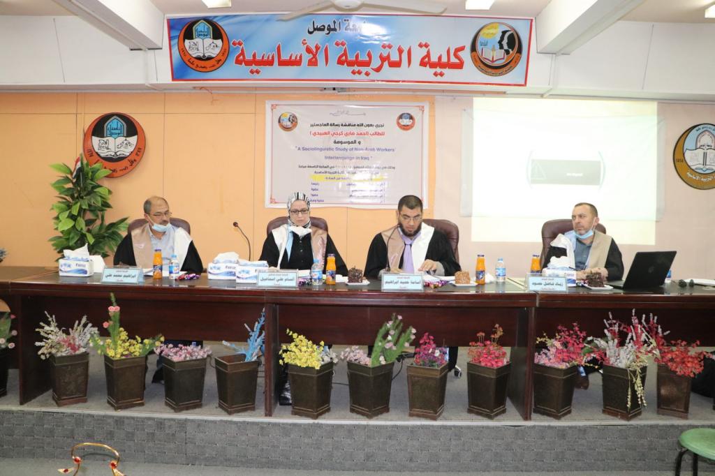 بحضور السيد عميد كلية التربية الاساسية الاستاذ الدكتور صفاء الدين عبد الله سليمان والاستاذ الدكتور محمد توفيق عثمان ال حسين معاون العميد للشؤون العلمية تمت صباح يوم الثلاثاء الموافق 15/9/2020 مناقشة طالب الماجستير ( احمد ضاري كرجي ) من قسم اللغة الانكليزية في كلية التربية الاساسية عن رسالته الموسومة ( A Sociolinguistic Stady of Non- Arab Workers’ Interlanguage in Iraq “ ) .وتألفت لجنة المناقشة من السادة التالية اسماءهم في أدناه :