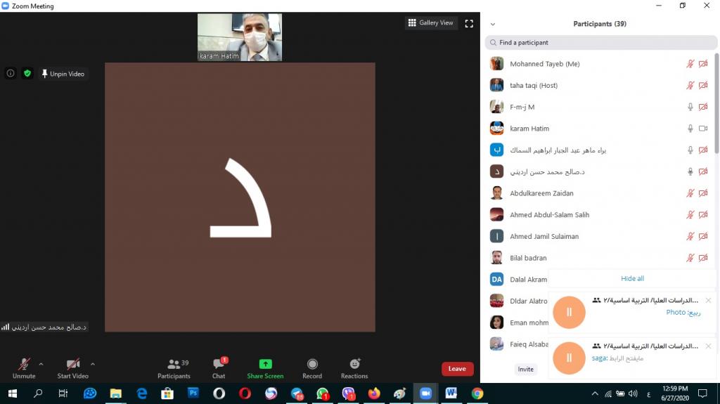 باشراف الاستاذ الدكتور صالح ارديني عميد كلية التربية الاساسية وإدارة الكترونية من قبل الاستاذ الدكتور محمد توفيق عثمان معاون العميد للشؤون العلمية بدأ اليوم الثاني لامتحانات نهاية الفصل الثاني لطلبة الدراسات العليا في الكلية بالساعة الواحدة ظهرا من يوم السبت الموافق 27/6/2020 وعبر الفضاء الالكتروني باستخدام منصة Edmodo ، يذكر ان السيد مساعد رئيس الجامعة للشؤون العلمية الاستاذ الدكتور منير سالم طه المحترم تفقد الامتحانات وتحدث إلى السيد العميد والمعاون وطلبة الدراسات العليا قبل الامتحان مطمئنا على سير الامتحانات ومتفقدا لأحوال الطلبة الذين أبدوا ارتياحهم لطريقة الامتحان والمنصة المعتمدة، وقدموا شكرهم وعرفانهم لرئاسة الجامعة والى السيد المساعد وعمادة الكلية واللجنة الإلكترونية المشرفة ، وقد تم استخدام منصة Zoom للسيطرة على حضور الطلبة بالصورة والصوت ، حيث سارت الامتحانات بأجواء سلسة وحضور الكترونياً لجميع الممتحنين والذي بلغ عددهم 113 طالبا وطالبة من جميع الاختصاصات العلمية والانسانية في الكلية .