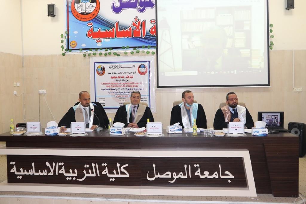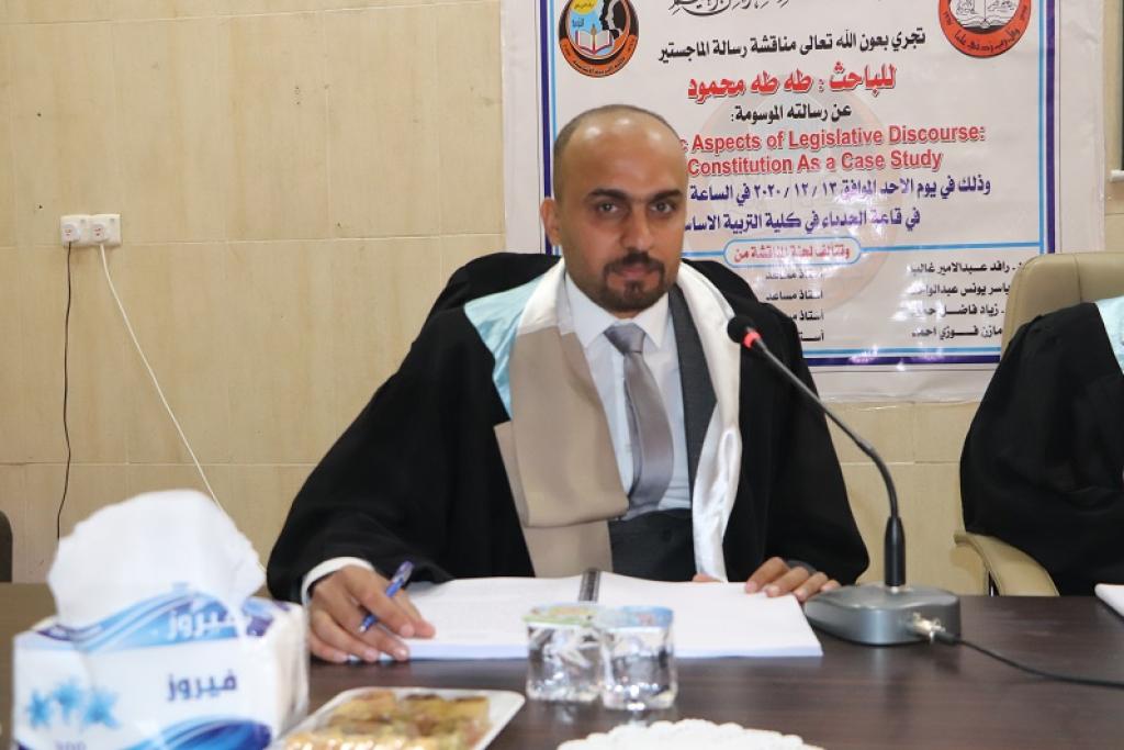 حضر السيد مساعد رئيس الجامعة للشؤون العلمية الأستاذ الدكتور منير طه البدراني والسيد عميد كلية التربية الأساسية الأستاذ المساعد الدكتور صفاء الدين عبد الله سليمان مناقشة طالب الماجستير طه طه محمود من قسم اللغة الإنكليزية في الكلية عن رسالته الموسومة ( Linguistic Aspects of Legislative Discourse : Iraqi Constitution As a Case Study ) وذلك يوم الاحد الموافق 13/12/2020