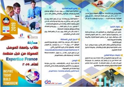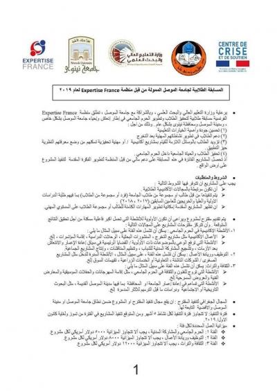 برعاية وزارة التعليم العالي والبحث العلمي وبالشراكة مع جامعة الموصل تطلق منظمةExpertise France الفرنسية مسابقة طلابية لتحفيز الطلاب وتطوير الحرم الجامعي في اطار انعاش واحياء جامعة الموصل بشكل خاص ومدينة الموصل بشكل عام.