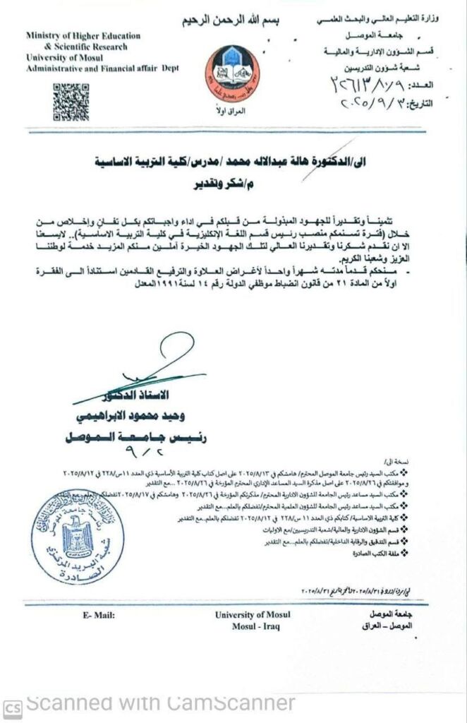 تدريسي من قسم اللغة العربية في كليتنا يحصل على كتاب شكر وتقدير من السيد رئيس جامعة الموصل….