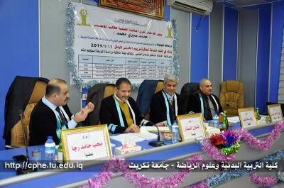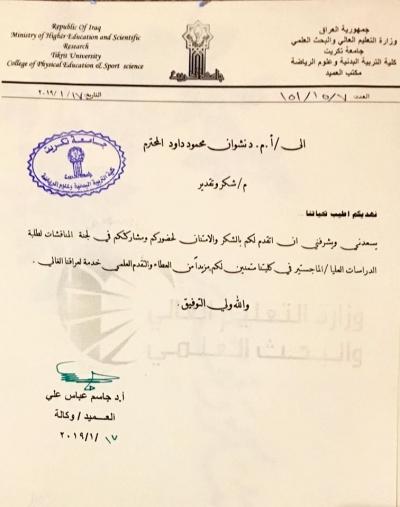 ترأس صباح يوم الخميس الموافق ٢٠١٩/١/١٧ الاستاذ المساعد الدكتور نشوان محمود الصفار التدريسي في قسم التربية البدنية وعلوم الرياضة في كلية التربية الاساسية لجنة مناقشة طالب الماجستير. محمد صبري محمد عن رسالته الموسومة (اثر التعلم النشط المصاحب لاستراتيجية النمذجة بالمشاركة في التحصيل المعرفي وتعلم مهارات كرة القدم لطلاب المرحلة المتوسطة ) في كلية التربية البدنية وعلوم الرياضة /جامعة تكريت وبعد المناقشة قام الاستاذ الدكتور جاسم عباس علي عميد الكلية بتوجيه كتاب شكر وتقدير للدكتور نشوان الصفار لحضوره ومشاركته في لجان المناقشة وتجشمه عناء السفر متمنياً له مزيداً من العطاء والتقدم العلمي .