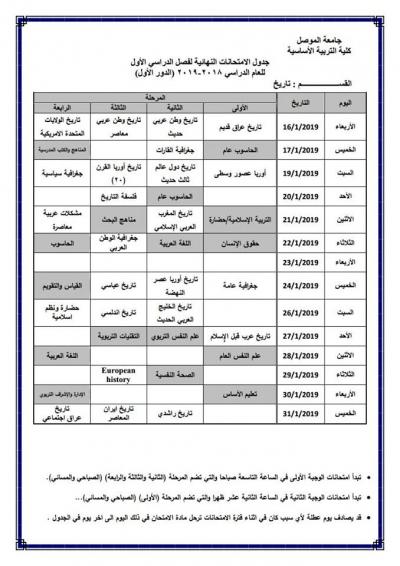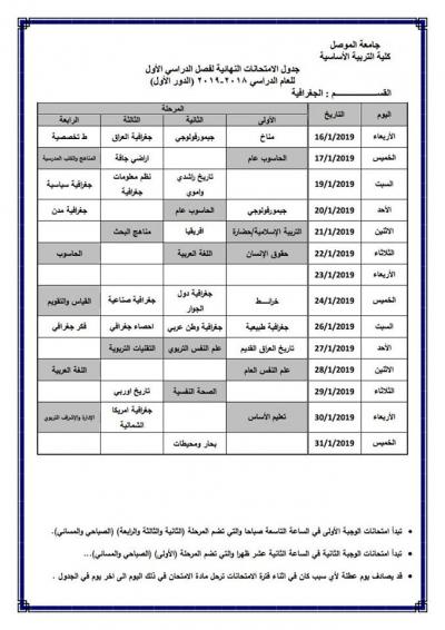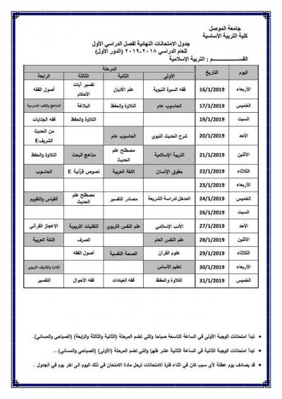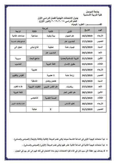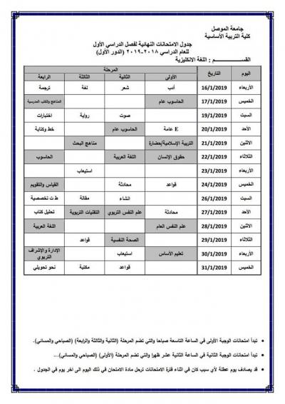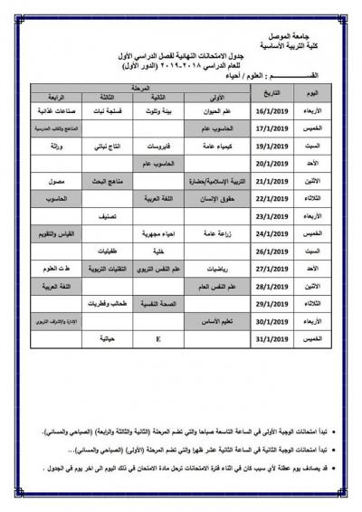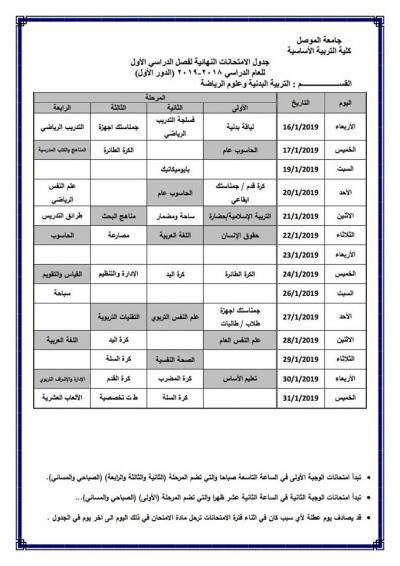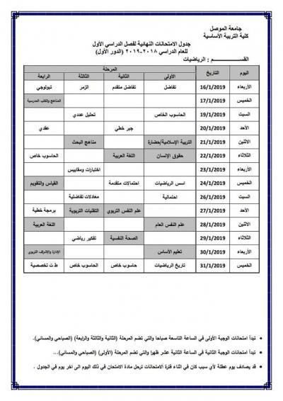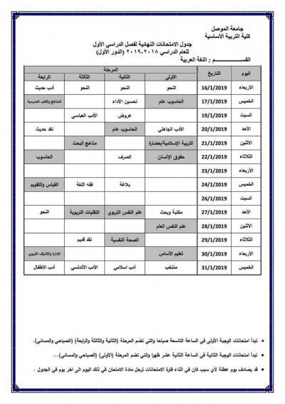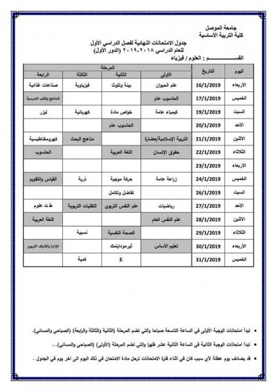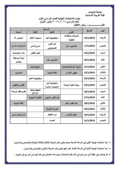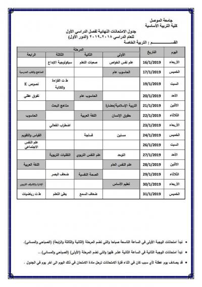 جدول امتحانات الدور الأول (للدراسة الصباحية والمسائية) لكلية التربية الأساسية للعام الدراسي 2018-2019