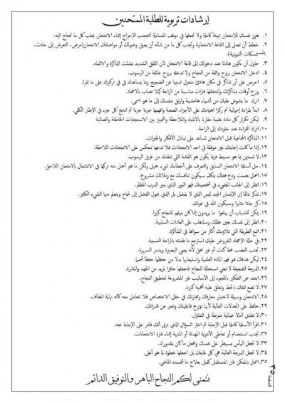 3. تبدأ امتحانات الوجبة الثانية في الساعة الثانية عشر ظهرا والتي تضم المرحلة (الأولى) (الصباحي والمسائي)4. لا يسمح للطلبة غير الملتزمين بالزي المحتشم بدخول القاعات الامتحانية.