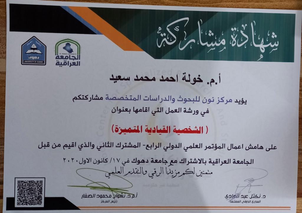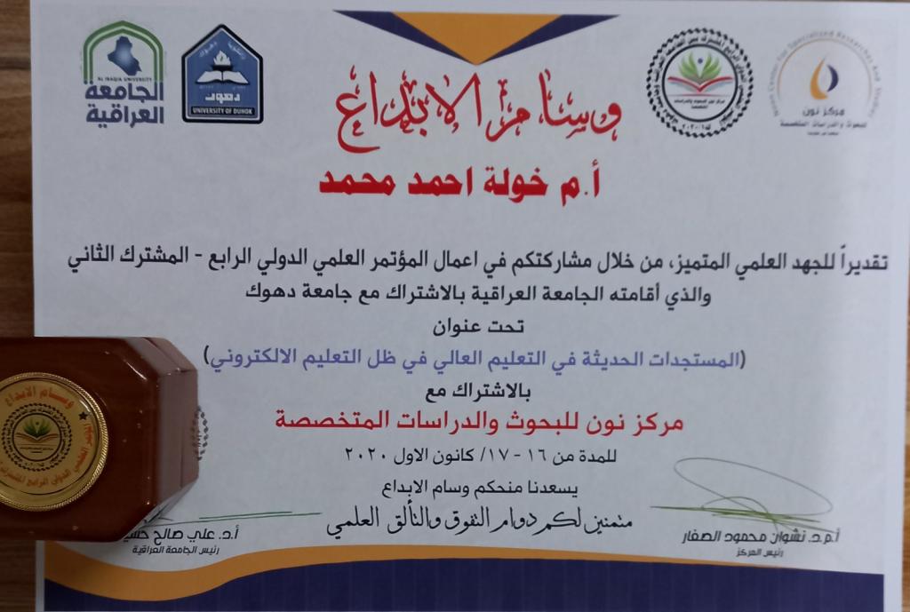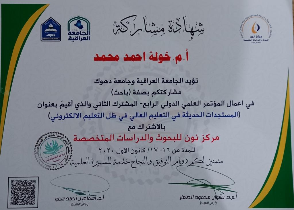 شاركت أ.م. خولة احمد محمد سعيد البريفكاني من قسم التربية الخاصة في كلية التربية الخاصة في المؤتمر الدولي والعلمي الرابع المشترك الثاني الذي أقيم من قبل الجامعة العراقية بالاشتراك مع جامعة دهوك ومركز نون للبحوث والدراسات المتخصصة للفترة من 16 – 17 /12/2020 وحصلت الست خولة علة شهادة مشاركة ودرع التميز .