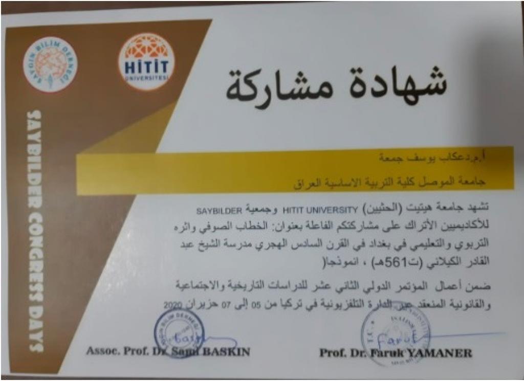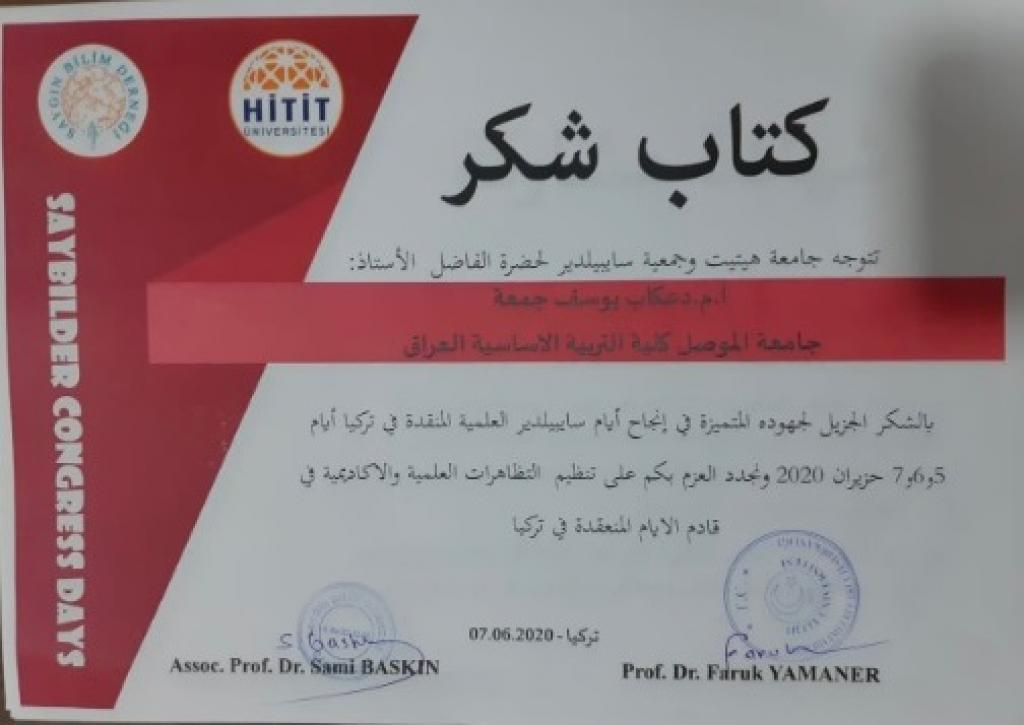 حصل أ.م.د. عكاب يوسف جمعة من قسم التاريخ في كلية التربية الاساسية على كتاب شكر ووسام تميز وشهادة مشاركة من جامعة هيتيت وجمعية سايبلدر التركية اثناء مشاركته ببحث في أعمال المؤتمر العلمي الدولي الثاني عشر للدراسات التاريخية والاجتماعية والقانونية الذي أقامته جامعة هيتيت / تركيا والمعتقد عبر الدائرة التلفزيونية للفترة من ٥ – ٧ حزيران ٢٠٢٠ .